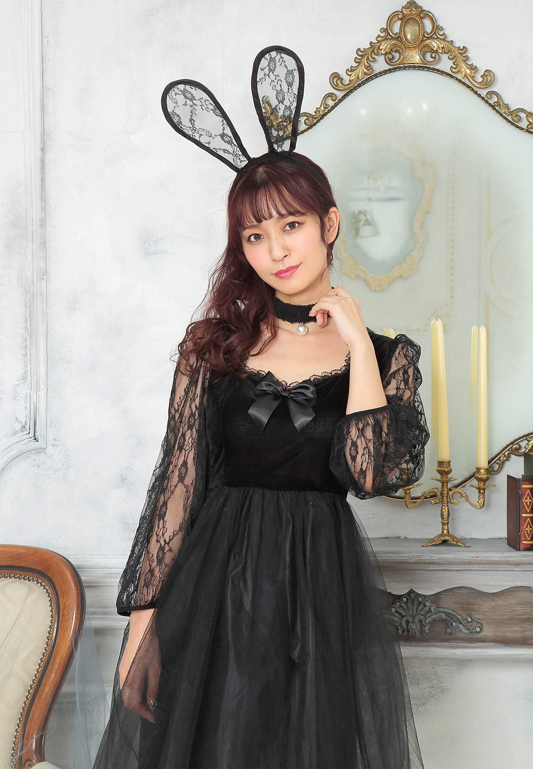 体型カバーも出来る長袖&膝丈のうさぎコスチューム。大きめレース耳のカチューシャがポイント。袖はレース素材でフェミニンな印象に。チュール重ねのボリュームあるスカートとパール付きチョーカーでドレスアップ。