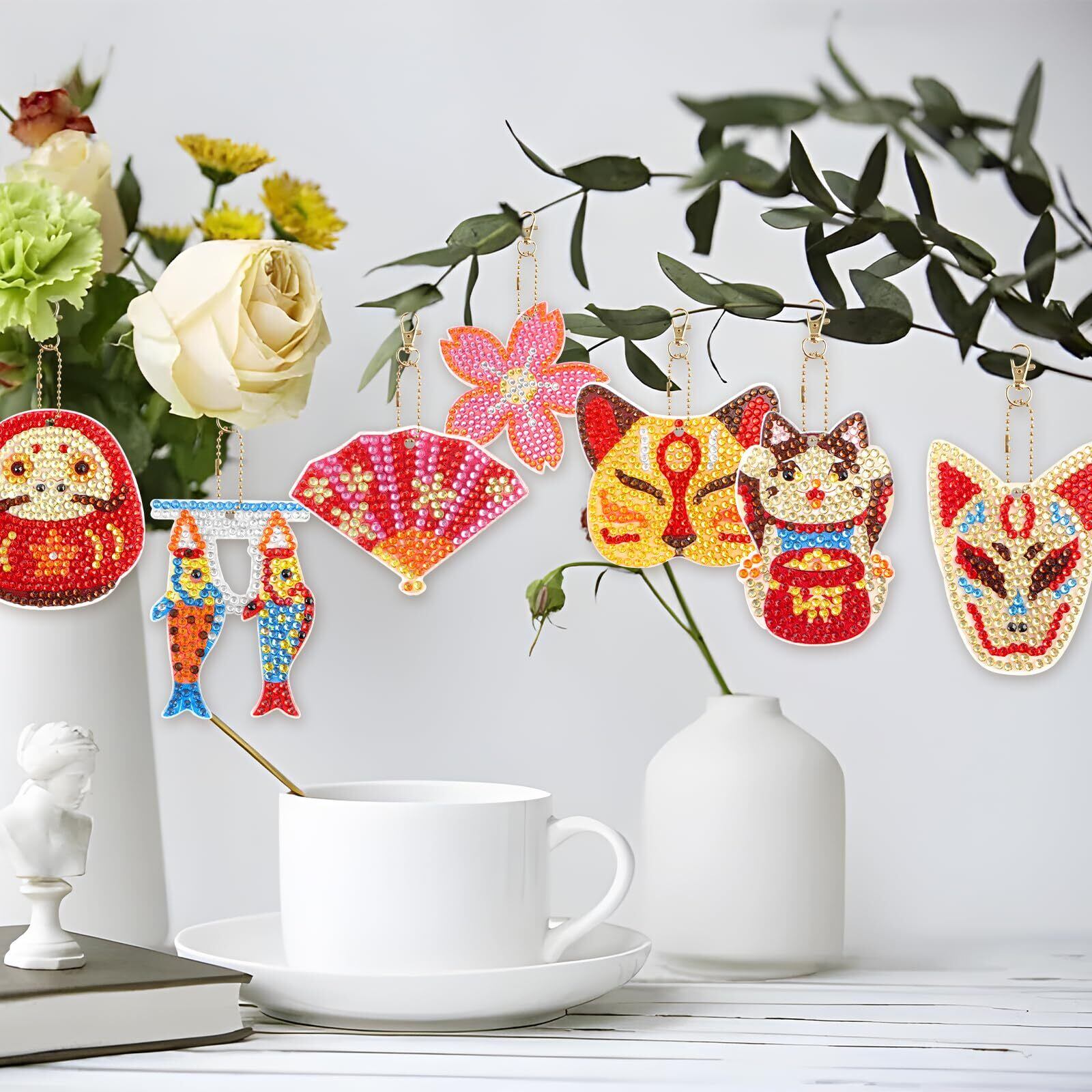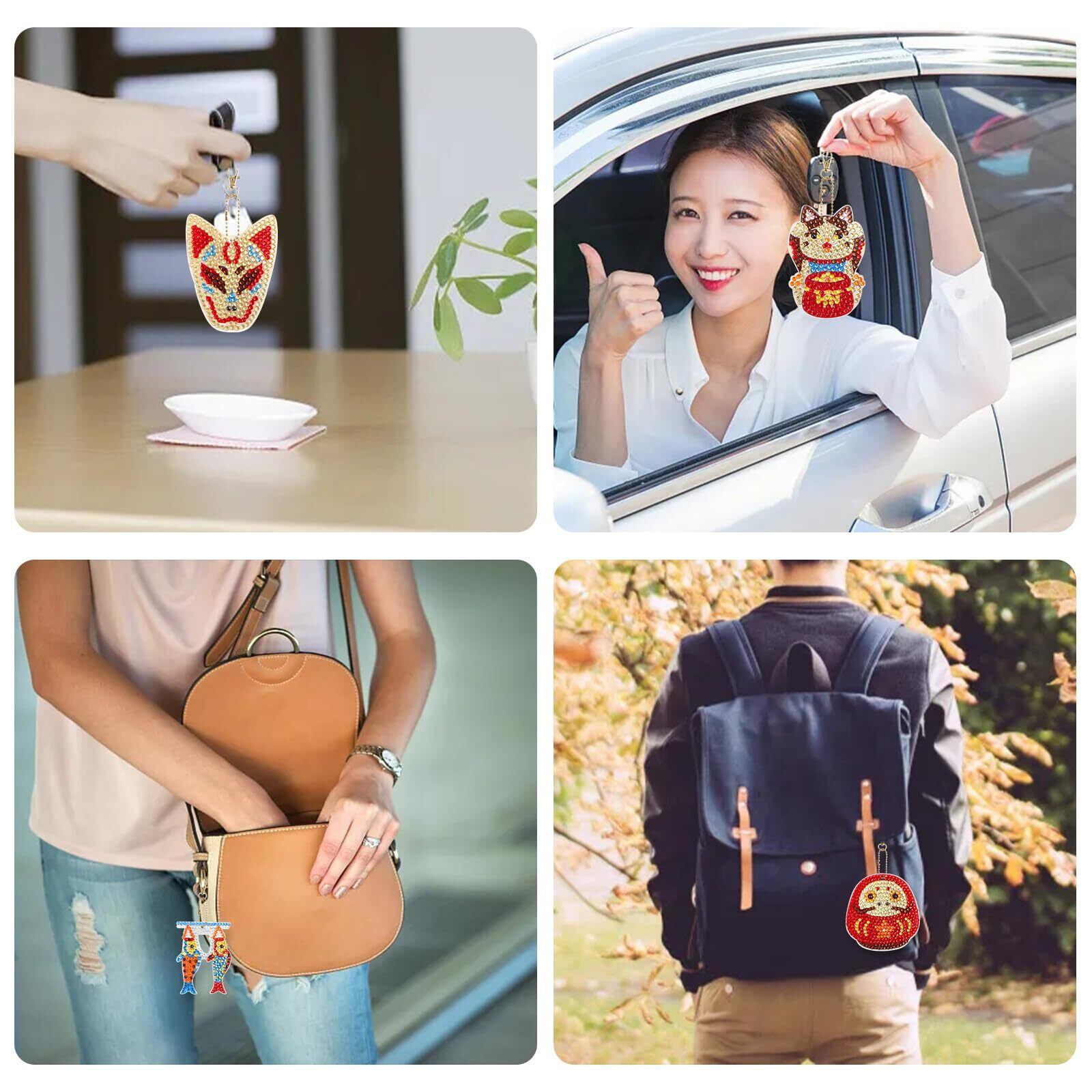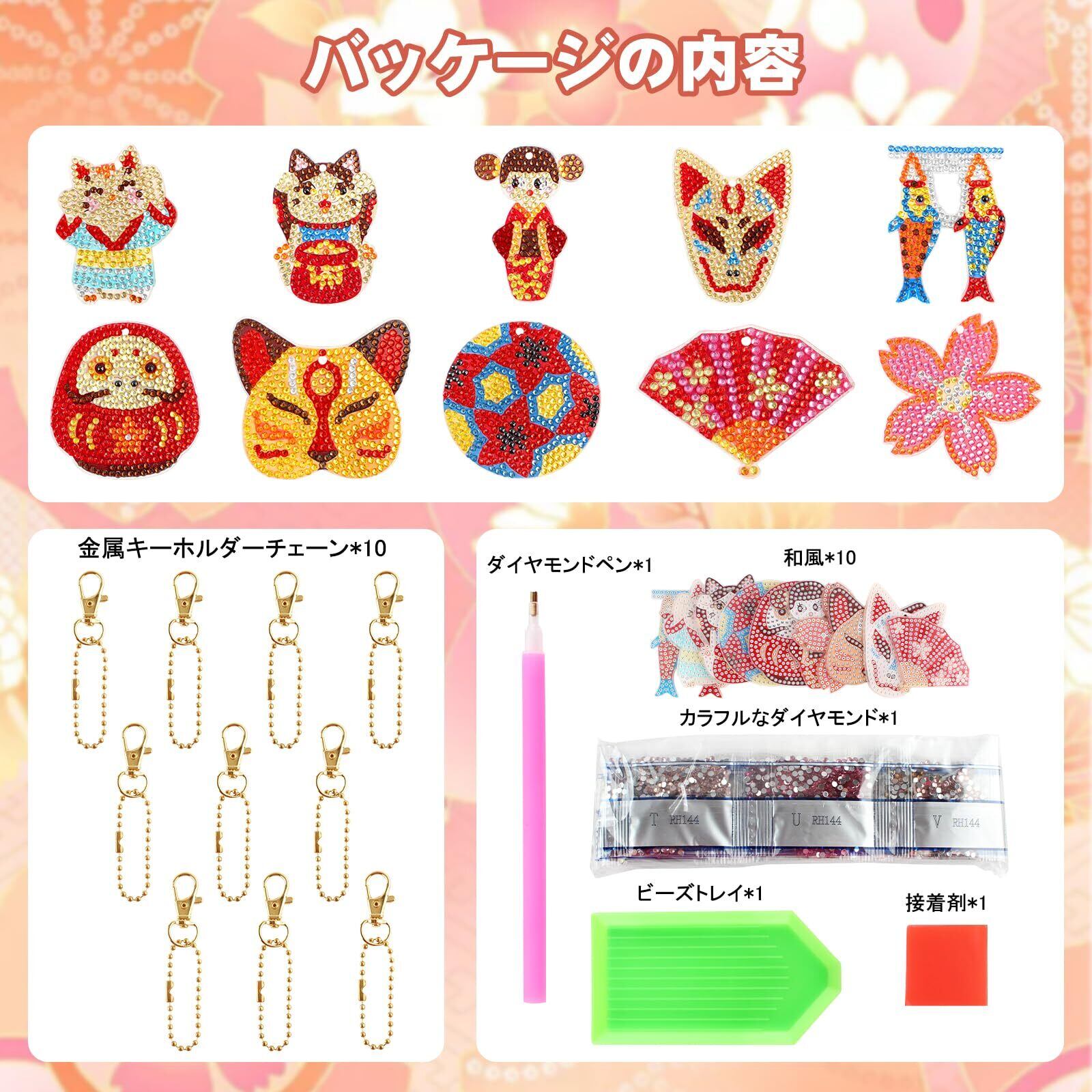 【ダイヤモンドアートキーホルダーパッケージ内容】 高品質樹脂 和風セットx10、金属キーホルダーチェーンx10、カラフルなダイヤモンドx1、ビーズトレイx1、ダイヤモンドペンx1、接着剤x1。完成したダイヤモンドアートは財布・キーペンダント・バッグなどに装飾することができ、きれいな装飾品になります。自分で手作りのプレゼントは、家族や友人にとって非常に意味があります。
