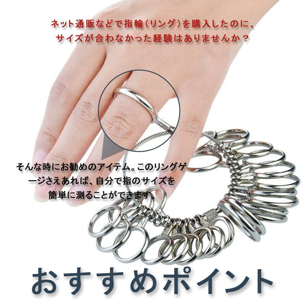 【注意事項】リングゲージ 自体の重さで 指 と ゲージ の間に隙間ができ、実際の サイズ より緩くなる場合があります。測定時には、ワイヤーから外すかや手のひらに接地させてお測り下さい。指輪を着ける指の腹より第二関節が太い方は、関節が無理なく通るサイズが適正なサイズとなります。体調などで指のサイズが変化することがございますので、朝夕それぞれ1回ずつ測定してください。
