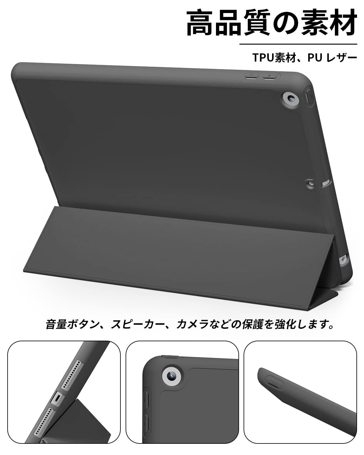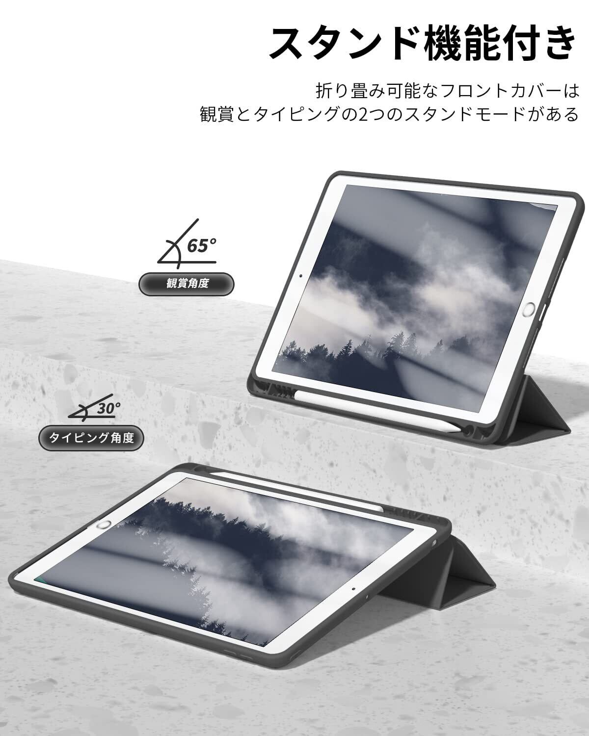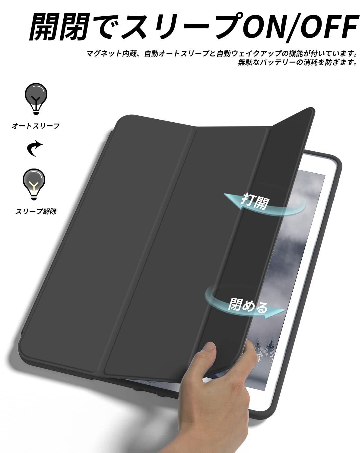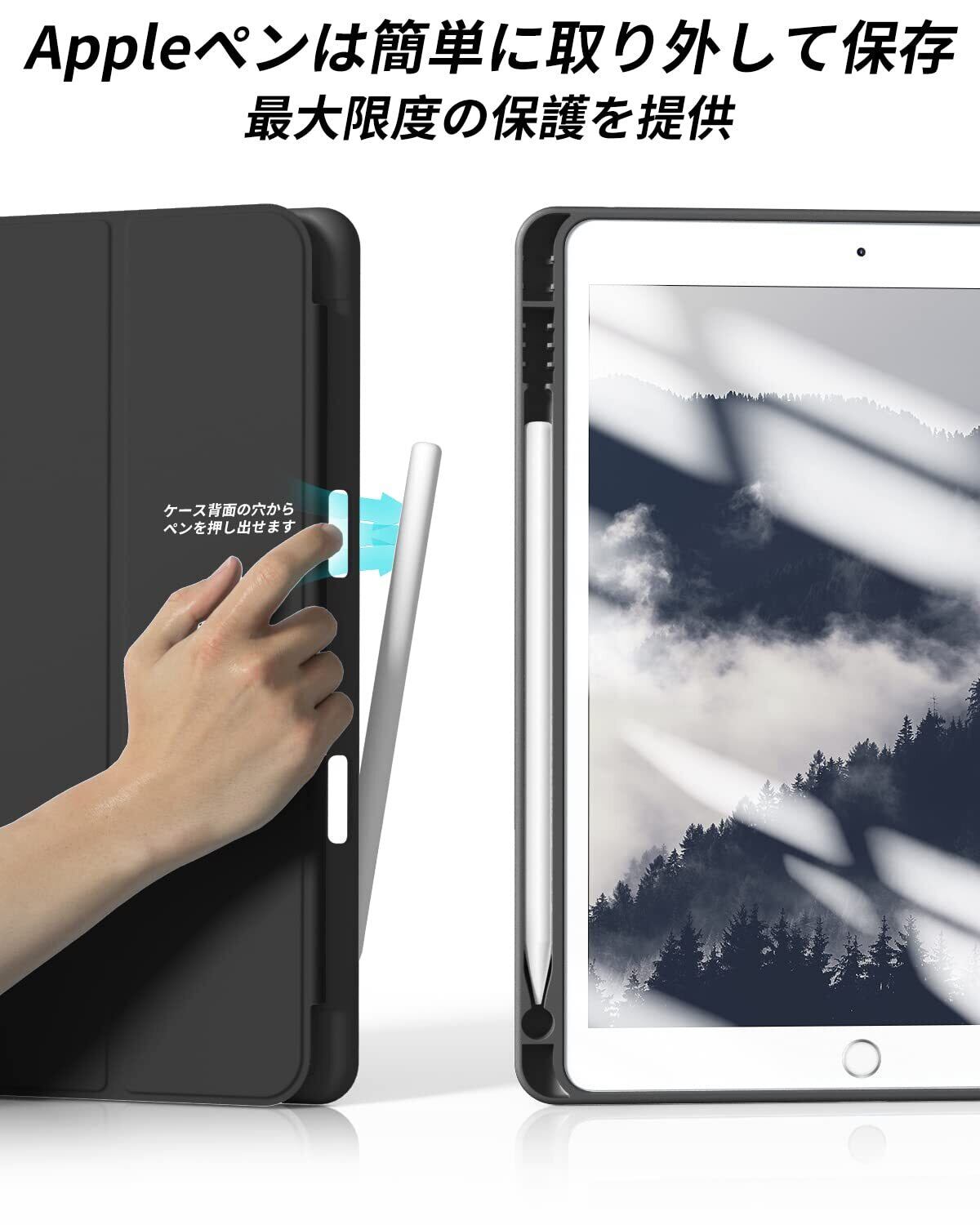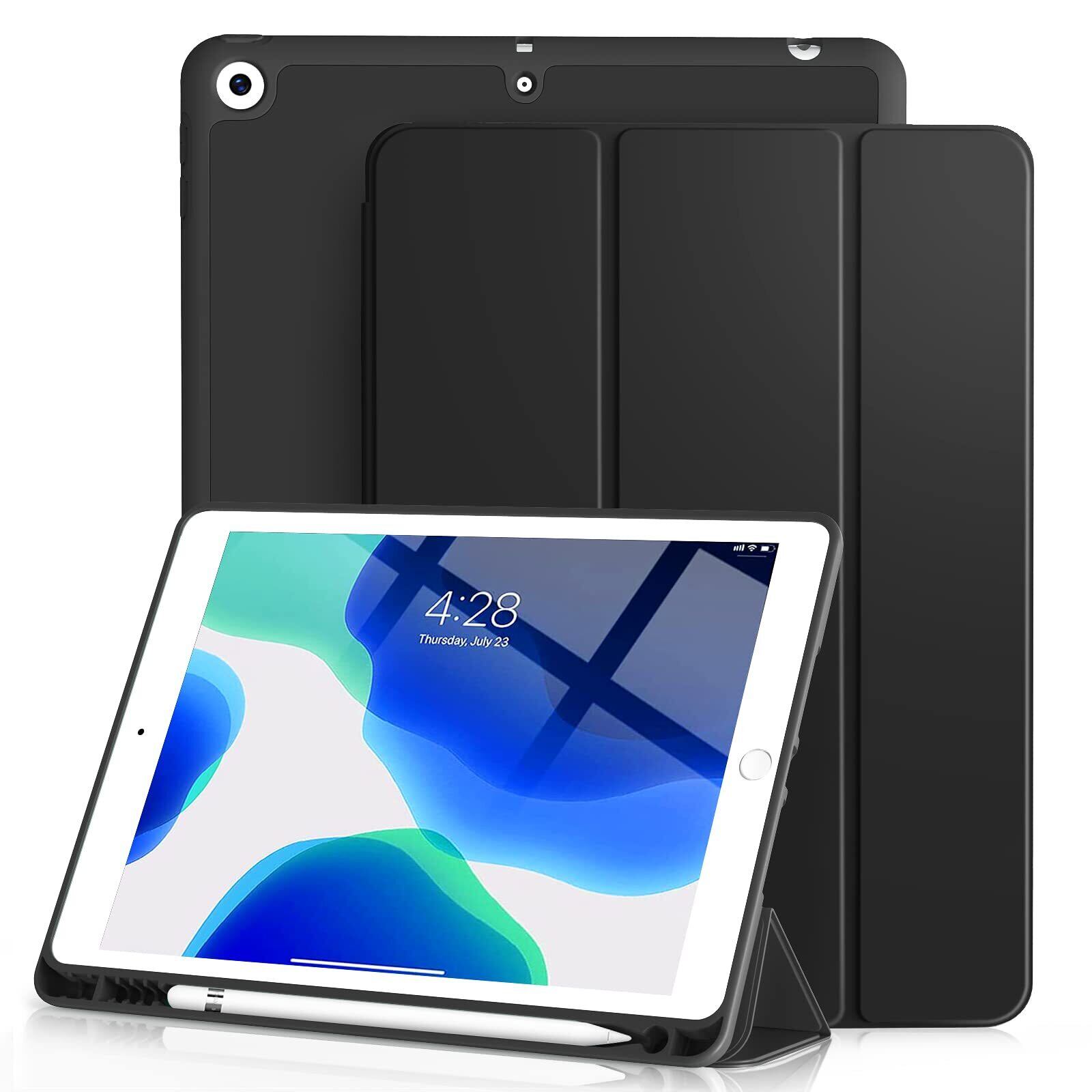 iPad 10.2 インチ 第9/8/7世代 (2021/2020/2019年) ケース オートスリープ/ウェイク機能対応 Apple Pencilペン収納・ホルダー付 スマートカバー ソフト TPU 薄型 軽量 耐衝撃 三つ折りスタンド ブラック