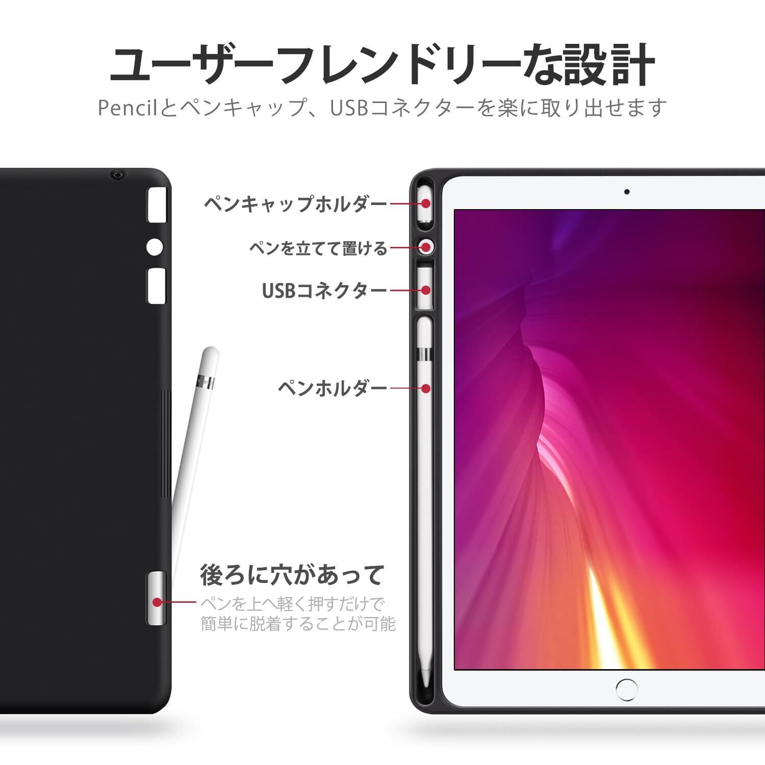 3、【ペンホルダー内蔵】ペン/ペンキャップ/ライトニングアダプタスロットが内蔵されており、これを使えば、ペンをしっかりと保管し紛失を避けることができます。スロットの後ろには3つの開口部があり、ペンやスペアパーツを楽に取り外すことができます。