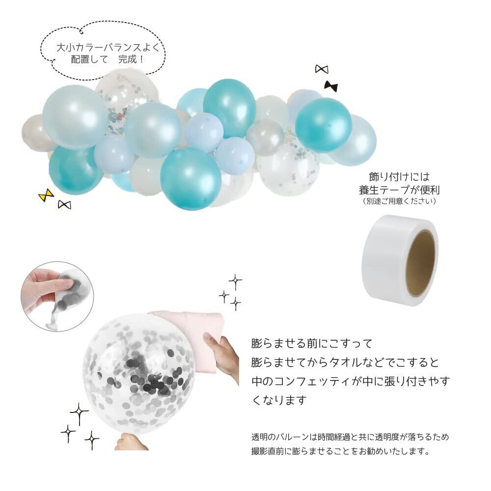 【注意事項】・ゴムバルーンは稀に検品では見つけにくい穴があいている場合がございます。予備バルーン各1個をお入れしておりますので、万一の際はご活用下さい。 ・小さなバルーンは口での膨らし難しい場合がございますのでエアポンプのご使用を推奨しております。・バルーンガーランドは約10日間ほどお楽しみいただけますが、空気を入れて作ってから約3-4日でツヤが無くなってきます。個体差、結びの度合いによってしぼみが早い場合があります。