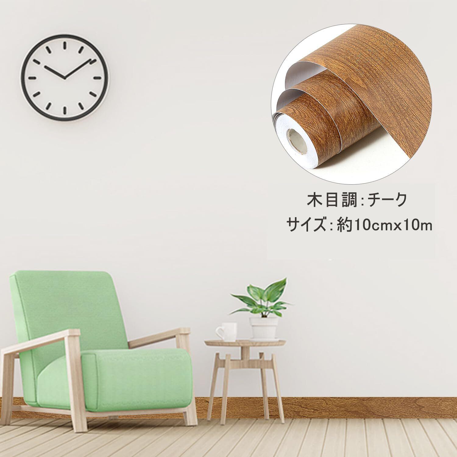 【仕様】サイズ:約10cmx10m 厚さ:約0.25mm 素材:PVC 表面処理方法:エンボス加工 木目調:チーク 内容物:マスキングテープ、おさえヘラ