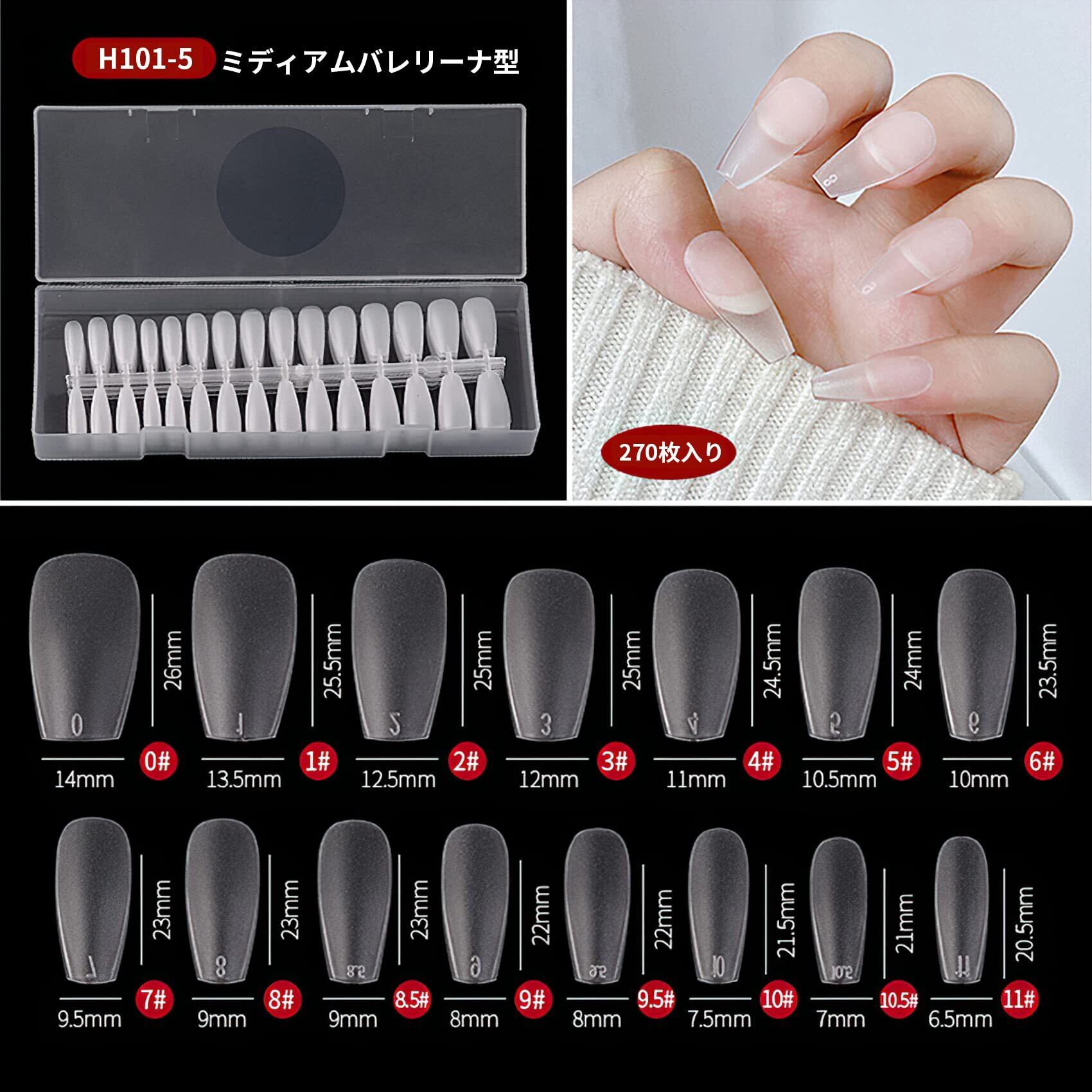 大容量で実用:ミディアムタイプのバレリーナ型ネイルチップセットです。15種類のサイズで様々な自爪のサイズに対応可能、合計270枚入り。付け爪、練習用どちらにもお使いいただけます。