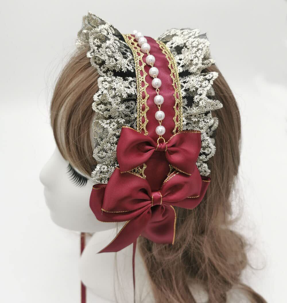 手作り ゴシック式ロリータ コスプレ カチューシャ。頭飾りの後ろに2つの隠されたヘアピンがあります。 光沢のあるリボン、絶妙な手作りのビーズチェーン、かわいいダブルボウ、レース、繊細なアイボリーホワイトのトリムで縁取られた暗黒系ロリータヘアアクセサリー。