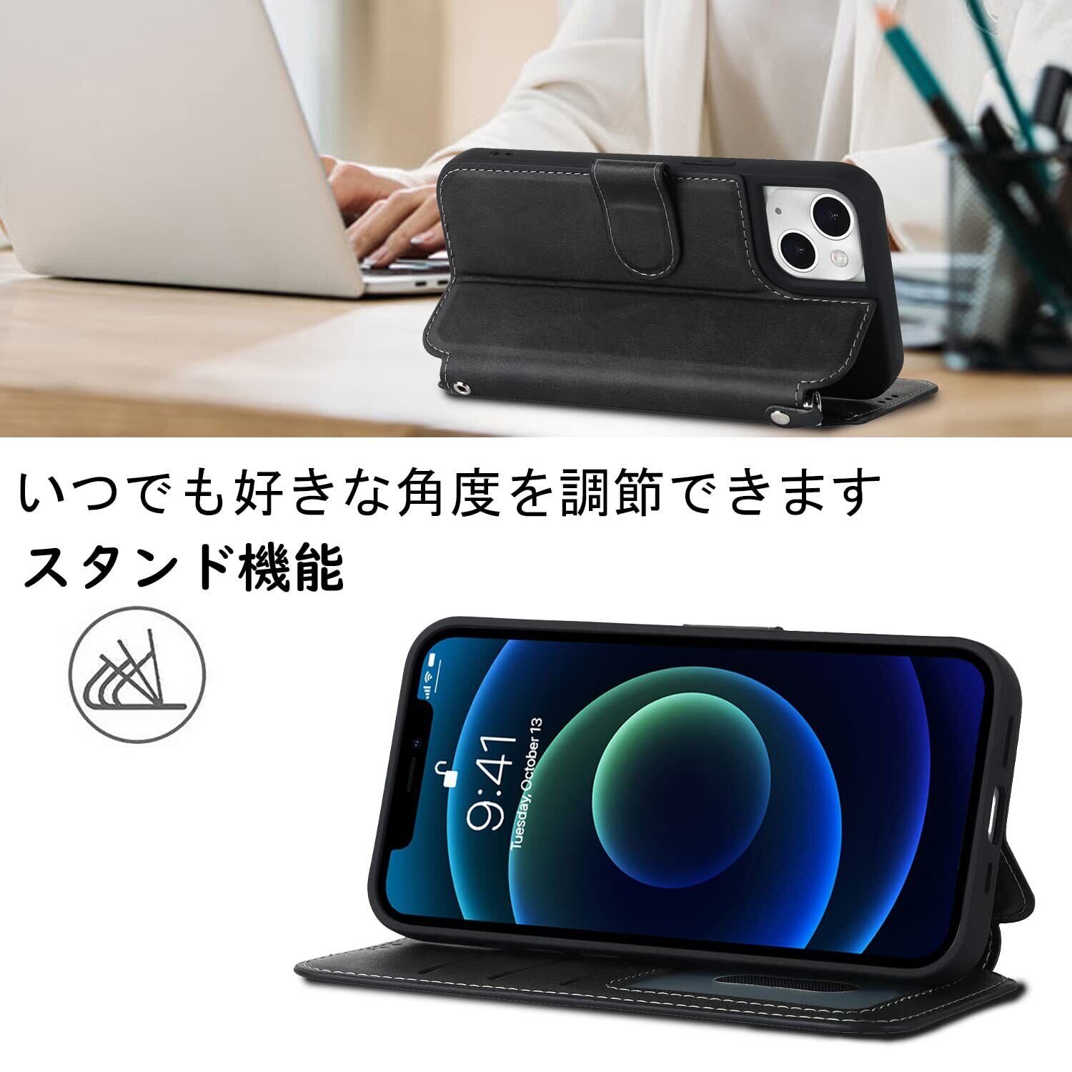 【横置きスタンド機能】マグネットが内蔵されているので、ベルトがなくてもフタがぴったり閉まります。横置きスタンド機能が付きまして、好きな角度を調節です。カバーにスピーカーホールを設置し、閉じた状態での通話を可能にしました。