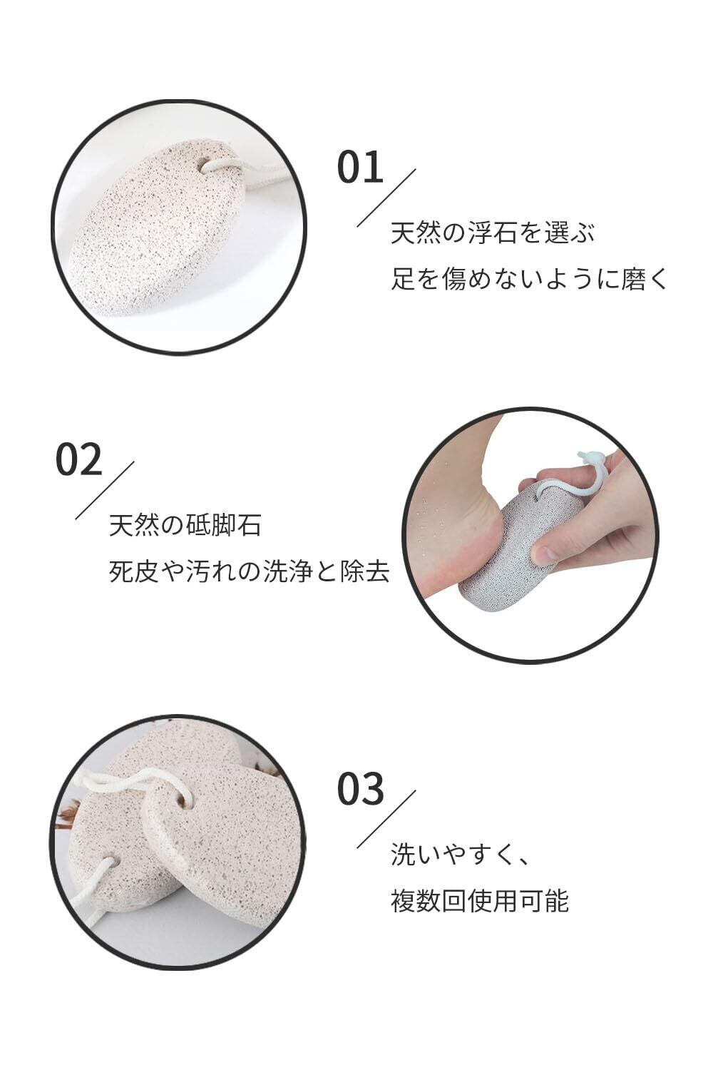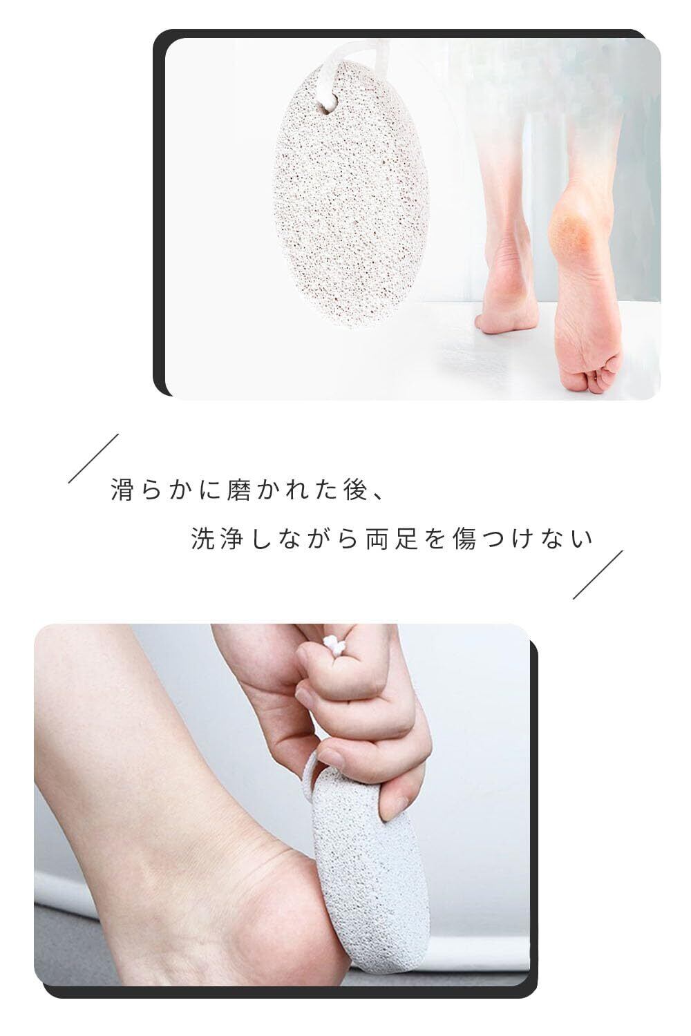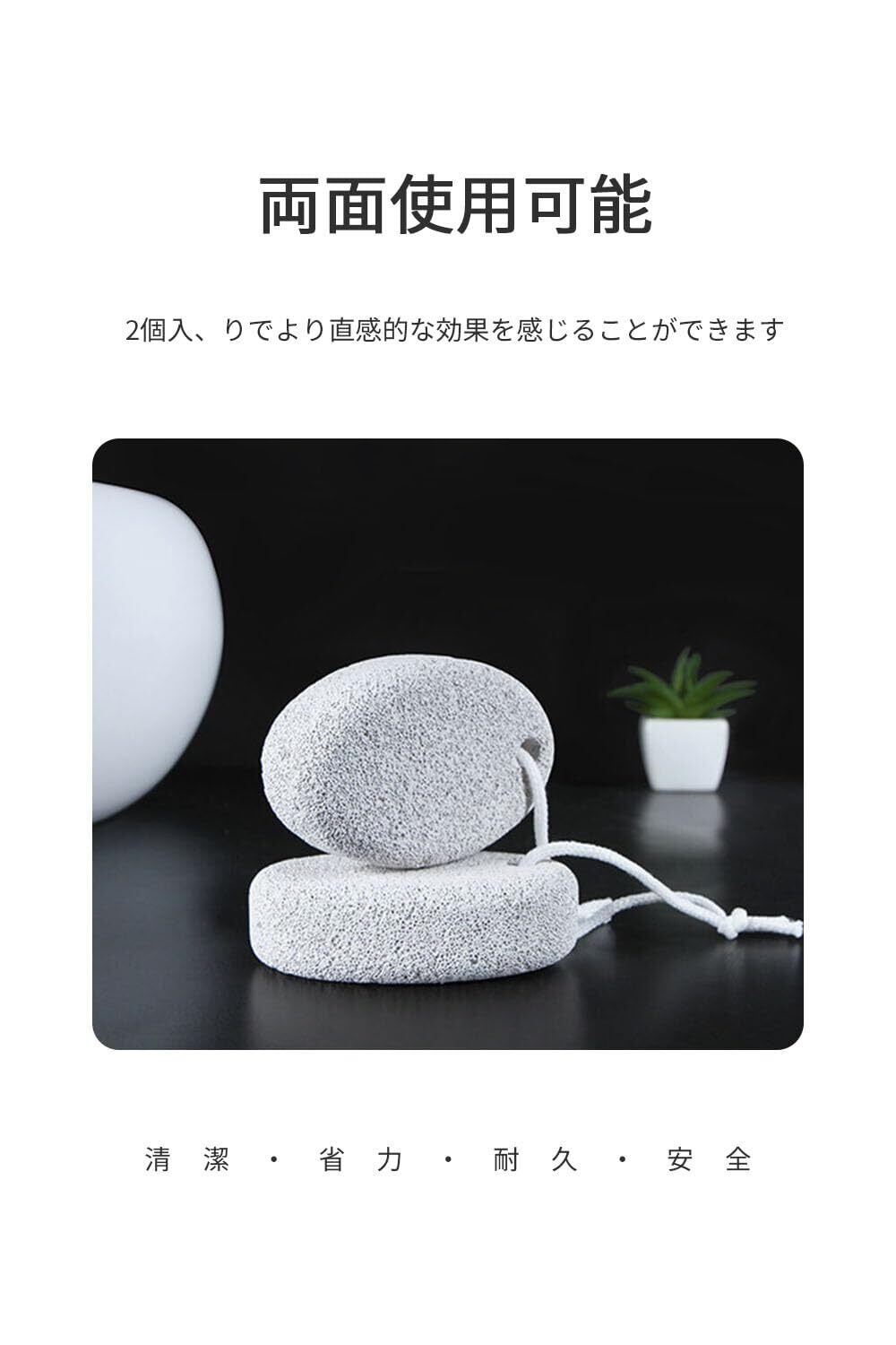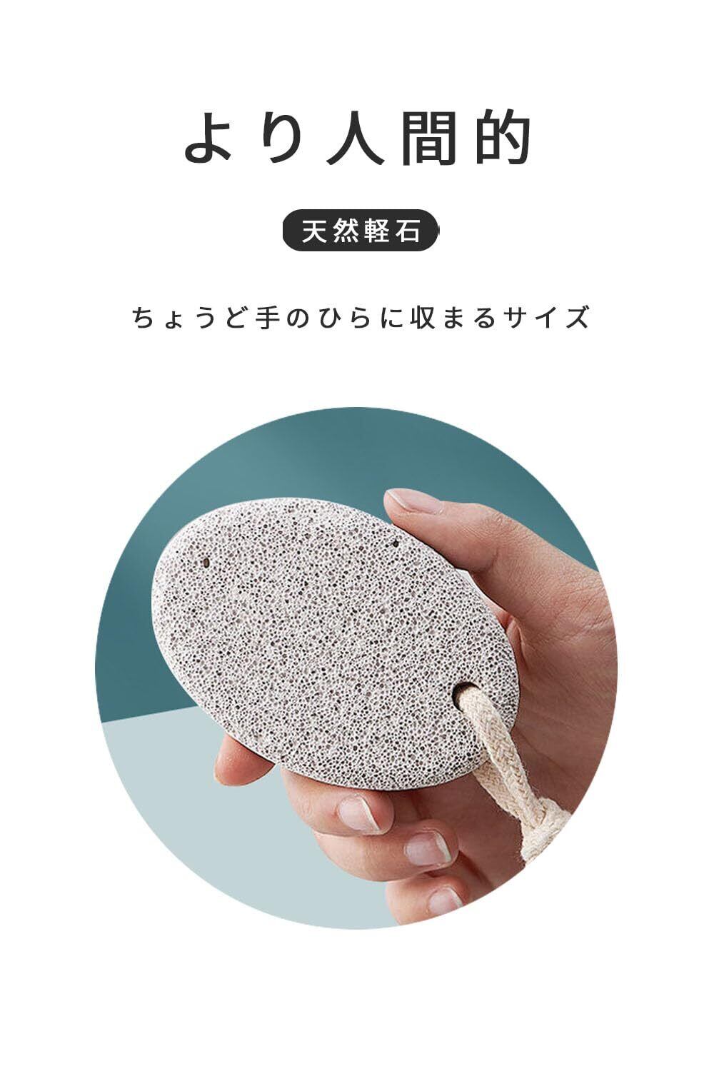 【商品特徴】細かな穴で角質除去、手に収まるサイズ感、ストラップ付きで収納便利、滑らかな表面で肌を傷つけず。重量:55g、素材:軽石、サイズ:9.5 x 5.5 x 2.5 cm、セット:2個。