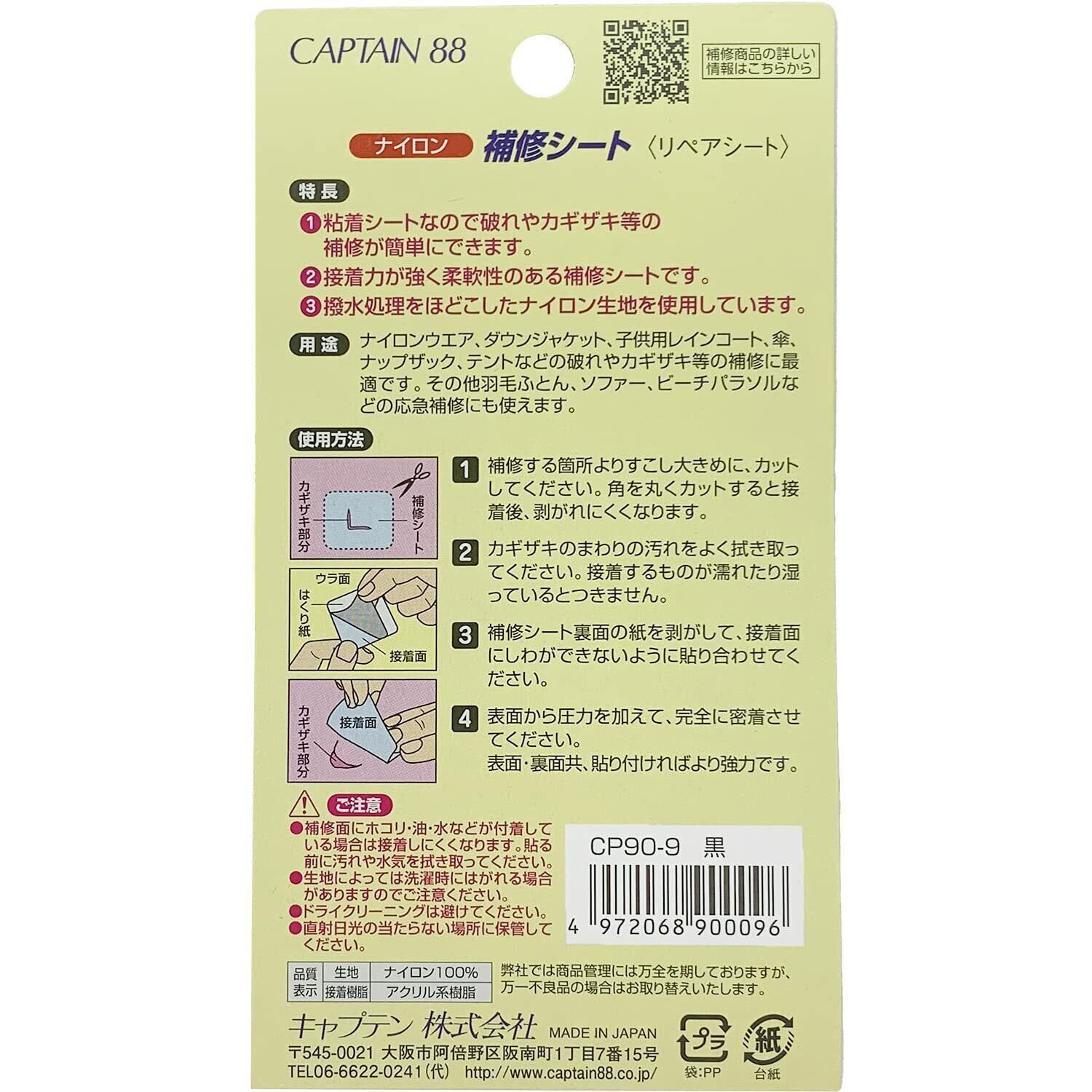 CAPTAIN88 キャプテン ナイロン 補修 シート 強力 粘着 7cm幅×30cm #9 黒 CP90