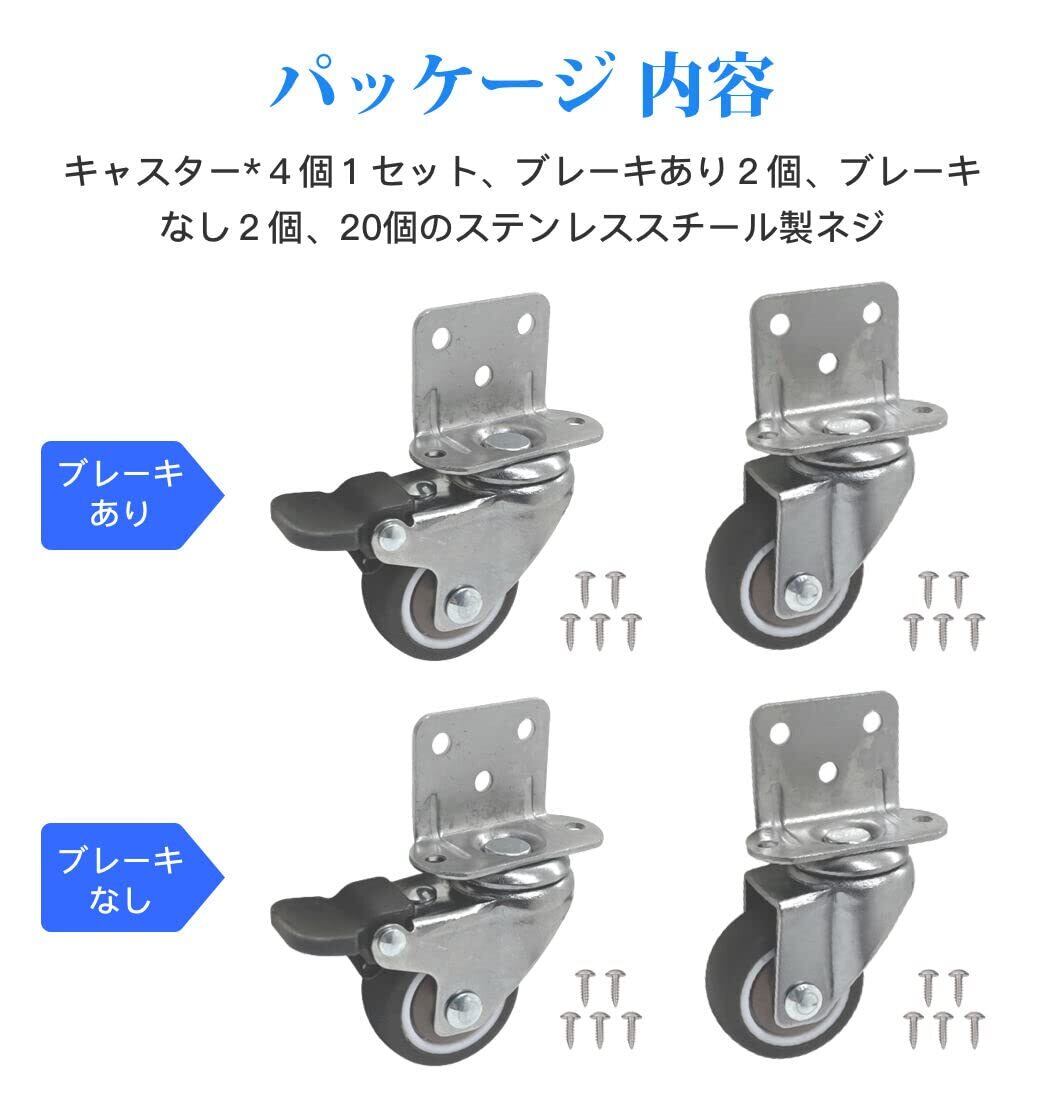 【パッケージ 内容】キャスター*4個1セット、ブレーキあり2個、ブレーキなし2個、20個のステンレススチール製ネジ。キャスター直径:1.25インチ。