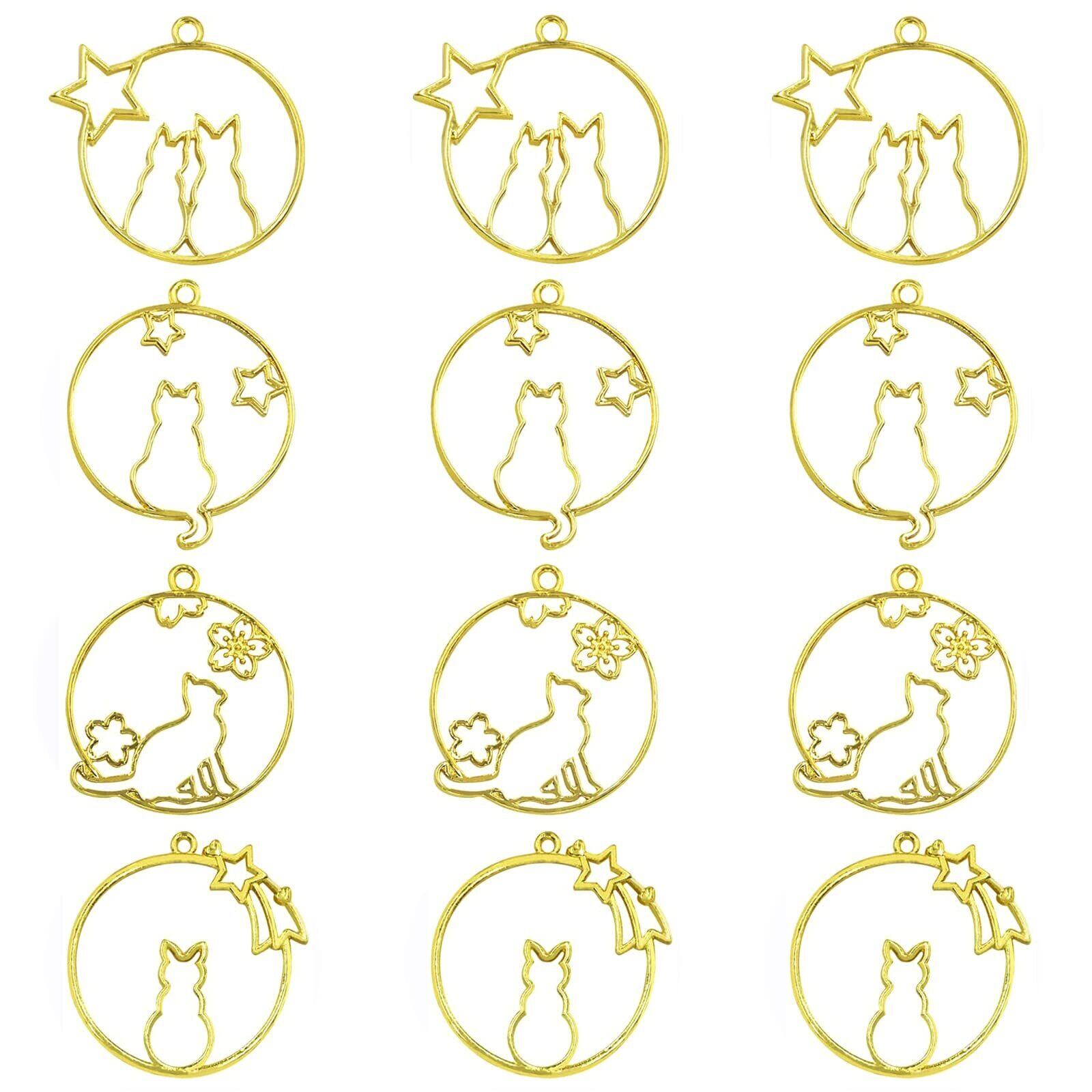 [サムコス] ゴールド ネコ 12個 セット レジン枠 空枠 フレーム パーツ カン付き ねこ ハンドメイド uvクラフト uvレジン 手作り DIY ペンダント キーホルダー アクセサリー フレーム (C)