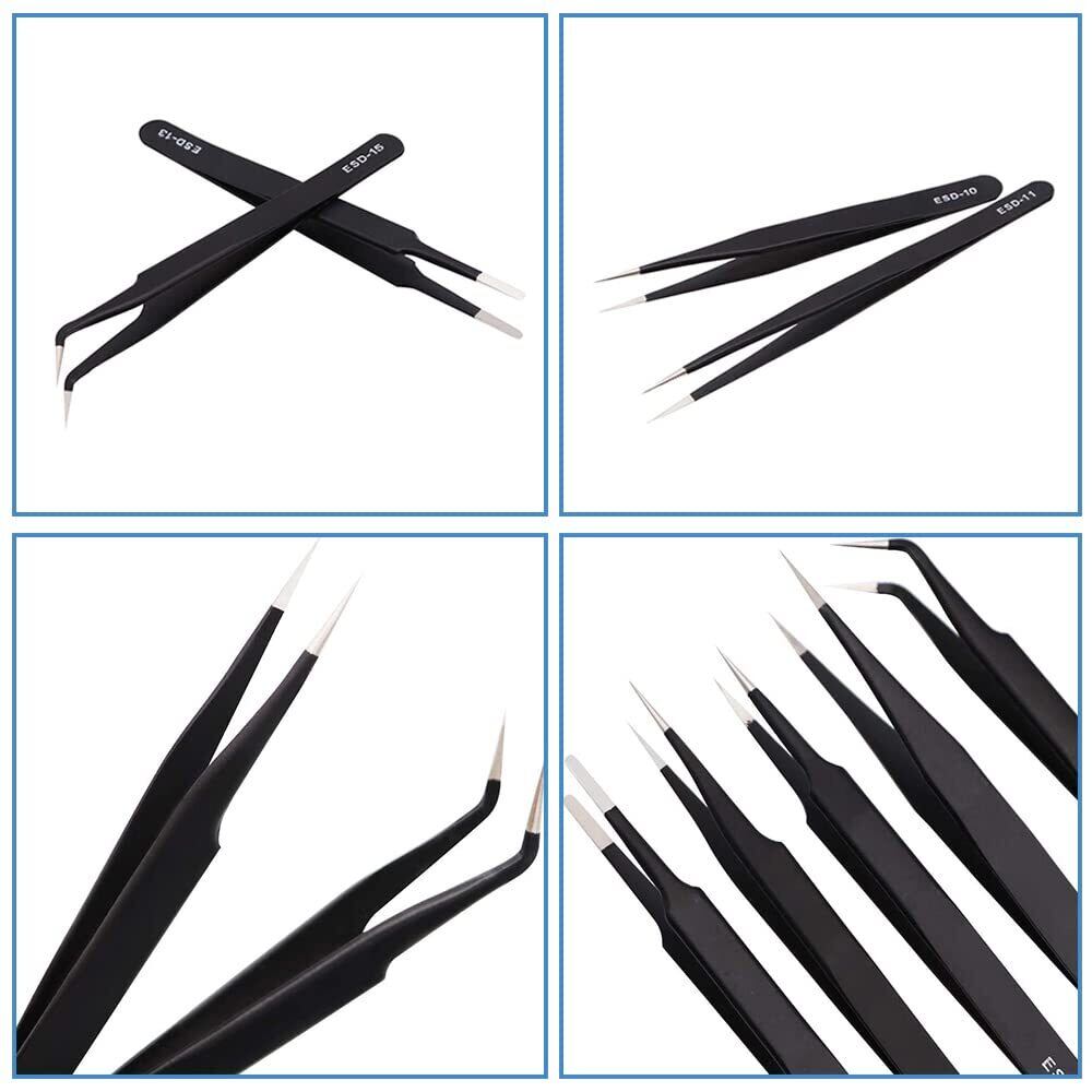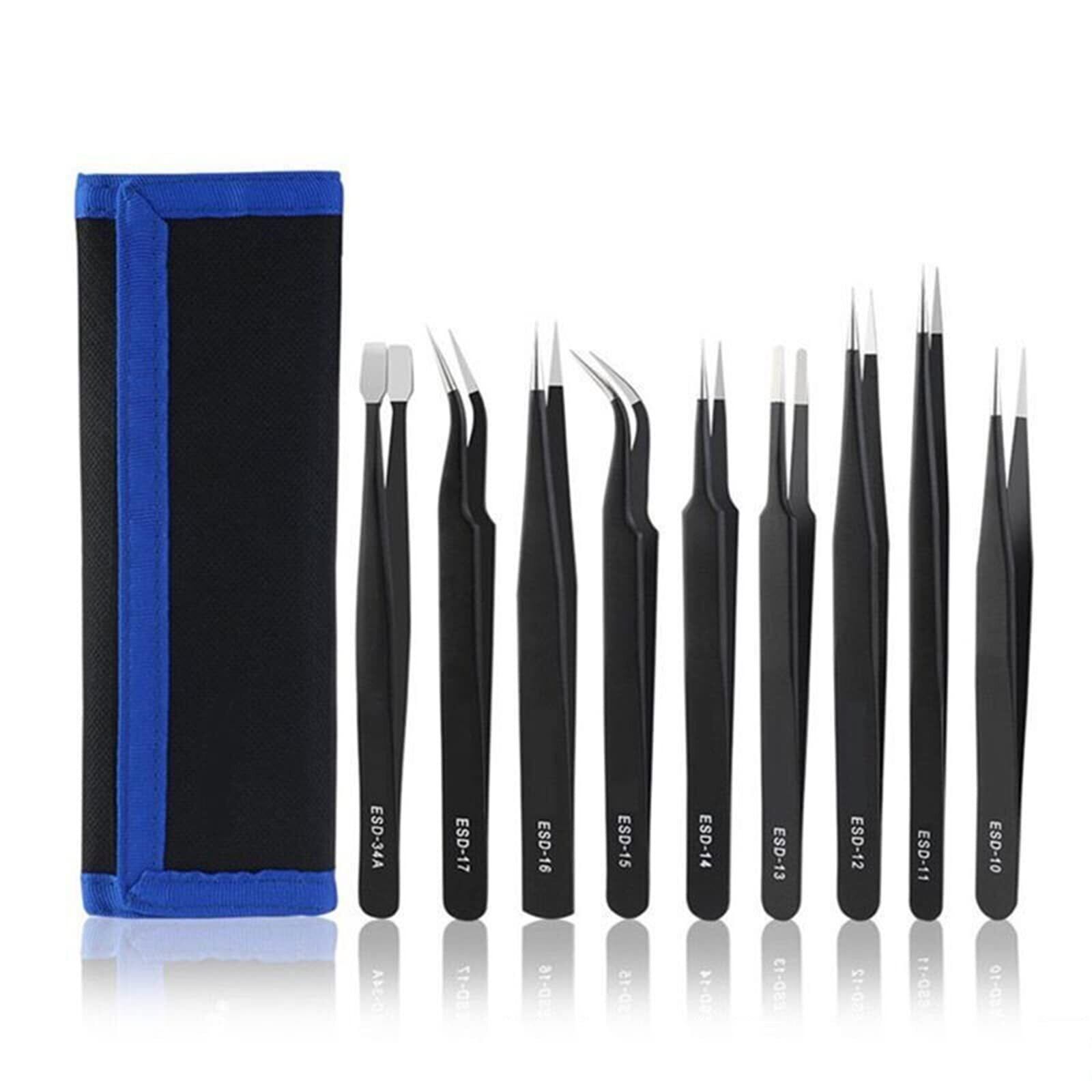 ピンセット 精密ピンセット 極細ピンセット ステンレス製 静電防止 防腐 精密機器用 1.5mm厚さ ESDピンセット 電子工作用、宝石、時計職人、模型製作用 (9個セット)