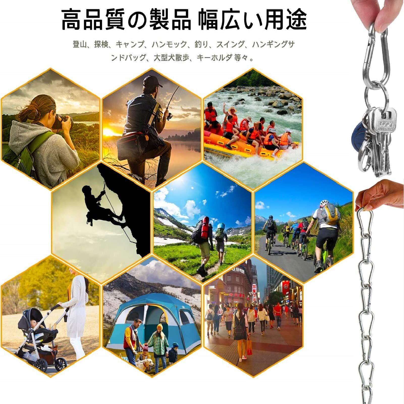 【様々な用途】当社のカラビナは屋内/屋外に最適です。 接続されたクライミングロープ、セーリング、ブランコ、遮光ネット接続、キャンプ、旅行、ハイキング、ホームジム、ウェイトリフティングマシンなど、さまざまな方法で使用できます。 大型カラビナはどこでも広く使われています。ロープ、チェーン、またはウェビングを簡単に接続するための一時的かつ恒久的な解決策として。
