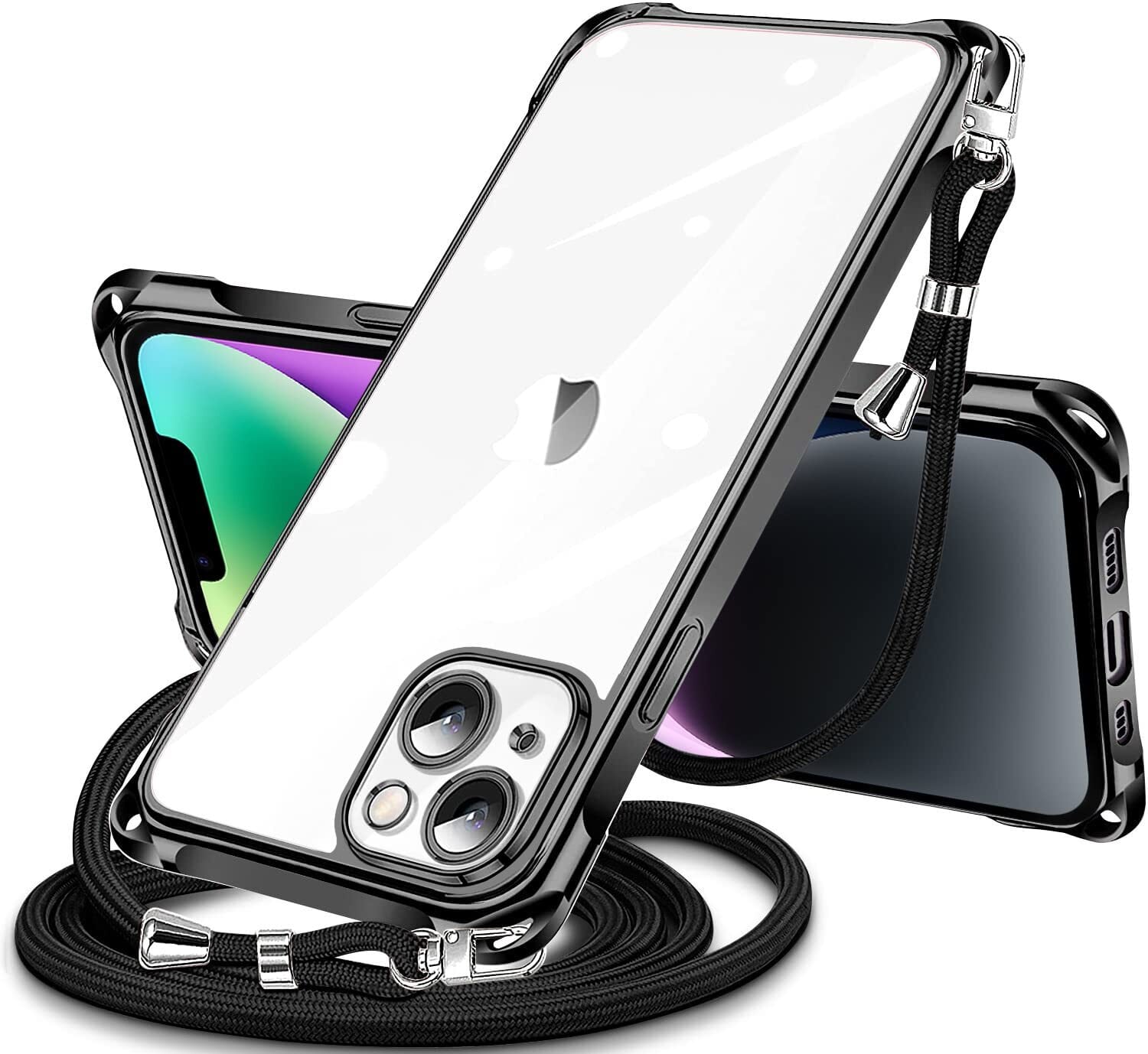 iPhone 13 用 ケース クリア ショルダー iphone13 用 スマホケース アイフォン13 カバー 肩掛け 斜めかけ 縄掛けケース 透明 TPU 薄型 軽量 耐衝撃 紐付き 斜めがけ 織りストラップ付き ネックストラップ ショルダー ケース 縦/横 2WAY 長さ調整可能 取り外し可能 落下防止 紛失防止 ワイヤレス充電対応 (ブラック)