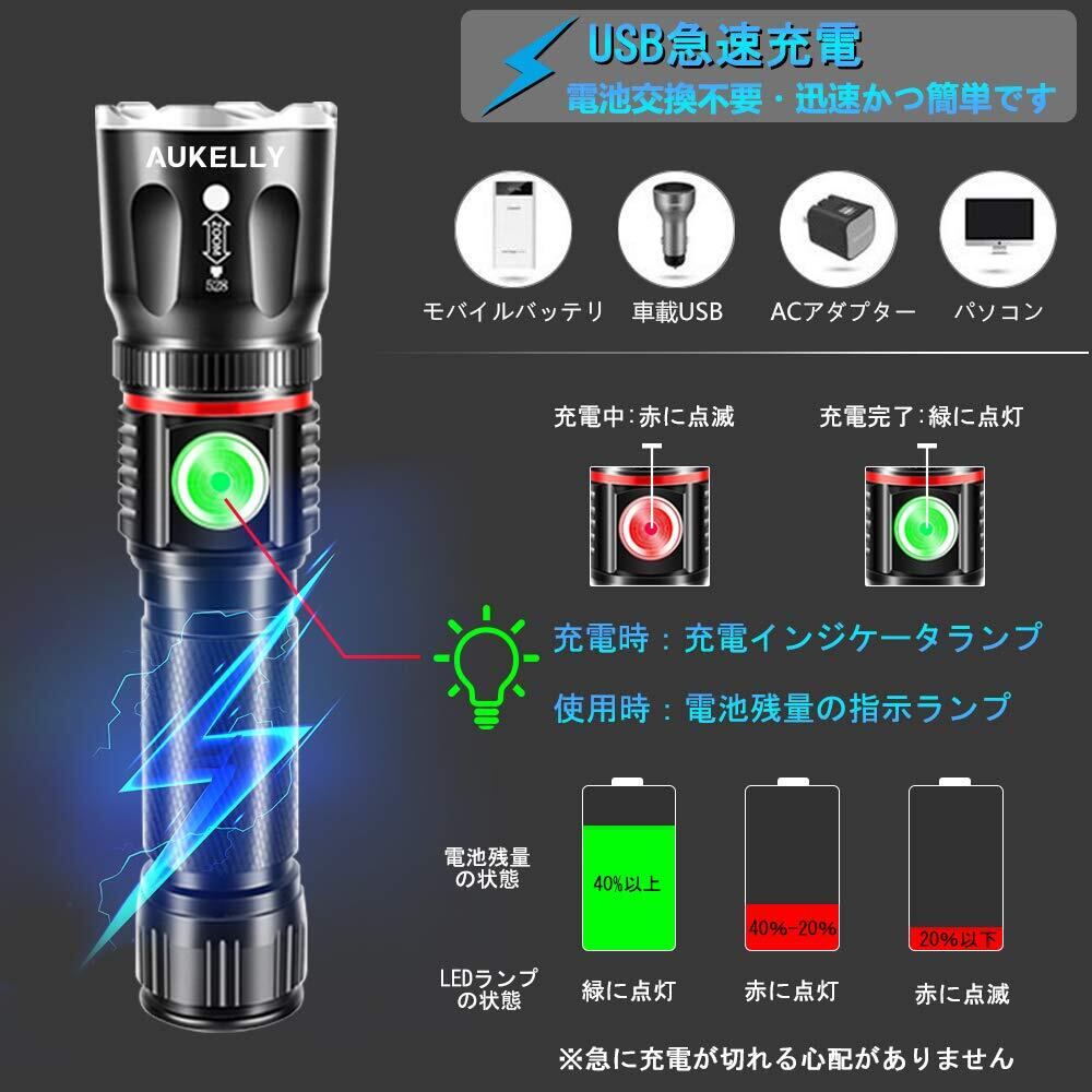【USB急速充電式&電池残量の指示ランプ付き】 こちらのLED懐中電灯の電源は充電池(付属)を使っています。単三のアルカリ乾電池を使っているLED懐中電灯とは違い、電池交換不要、バッテリーを取り外さずにType-Cケーブル(付属)で何度も充電できます。または充電指示ランプと電池残量指示ランプが付いていますので、急に充電が切れる心配がなくて安心してお使いいただけます。