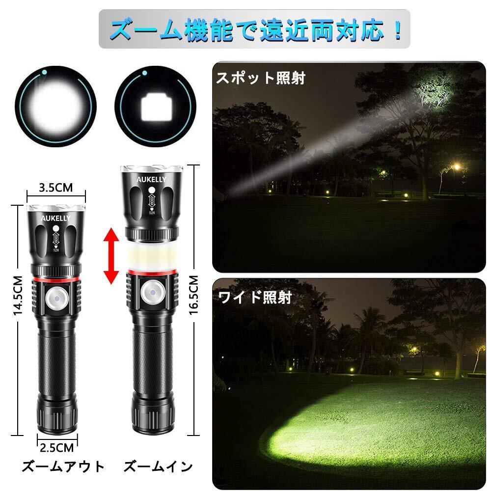 【懐中電灯・ランタン2in1&超強光LED採用】 AUKELLY 最新版H167型のLED懐中電灯は XML-T6LEDを搭載し、最大照射距離は約500メートルまで大変明るいです。また、この強力LED懐中電灯の中身には高散熱性のあるCOB(チップオンボード)を搭載し、均一な面発光(柔らかい昼光色)で360度をしっかり照らします。先端のライトを点灯させると懐中電灯としてご利用でき、COBライトを点灯させて、ランタンとしても使えます。
