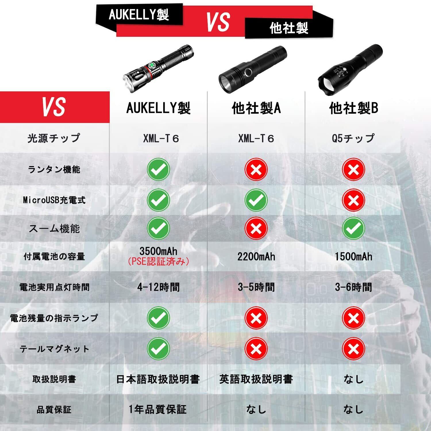【 12ヶ月品質保証&パッケージ内容 】 ①Aukelly Directからご購入後12ケ月間は返品・返金が対応致します。万が一、初期不良、破損などがあった場合には、注文番号をご記載の上、メールにてお気軽にご連絡ください。きちんと12時間以内に保証サービスをご対応致します。 ②パッケージ内容: AUKELLY H167型充電式LED懐中電灯 *1、充電池*1、USBケーブル*1、日本語取扱説明書(保証書兼ね)。