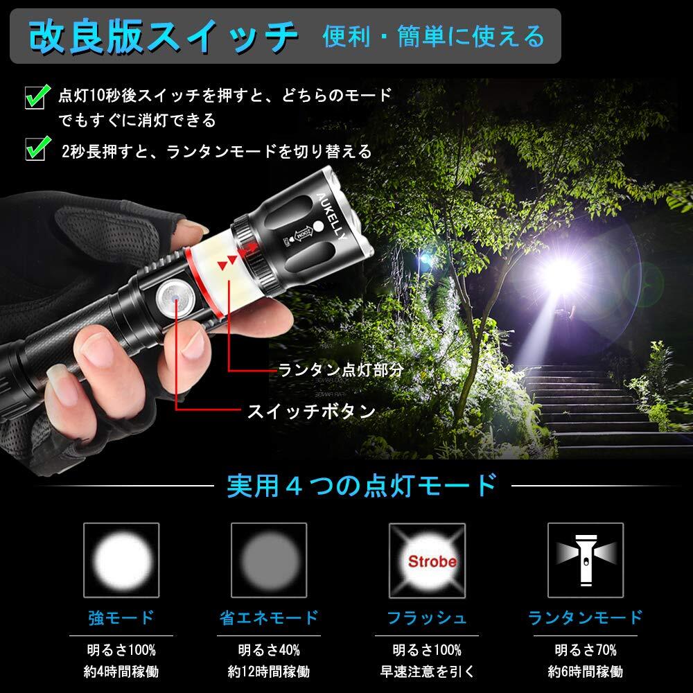 【実用4モード&ズーム機能搭載】 アップグレード版のLED懐中電灯は実用のランタンモードを追加しました。強モード/弱モード(省エネ)/SOSモード/ランタンモード4つの異なるモードの設定で、日常生活、防災、停電、アウトドア活動などに、各種の場面に対応できます。伸縮式のフォーカスレンズを搭載して、懐中電灯のヘッド部分をスライドさせるだけで照射範囲をワイドビーム、スポットビームに調整可能です。