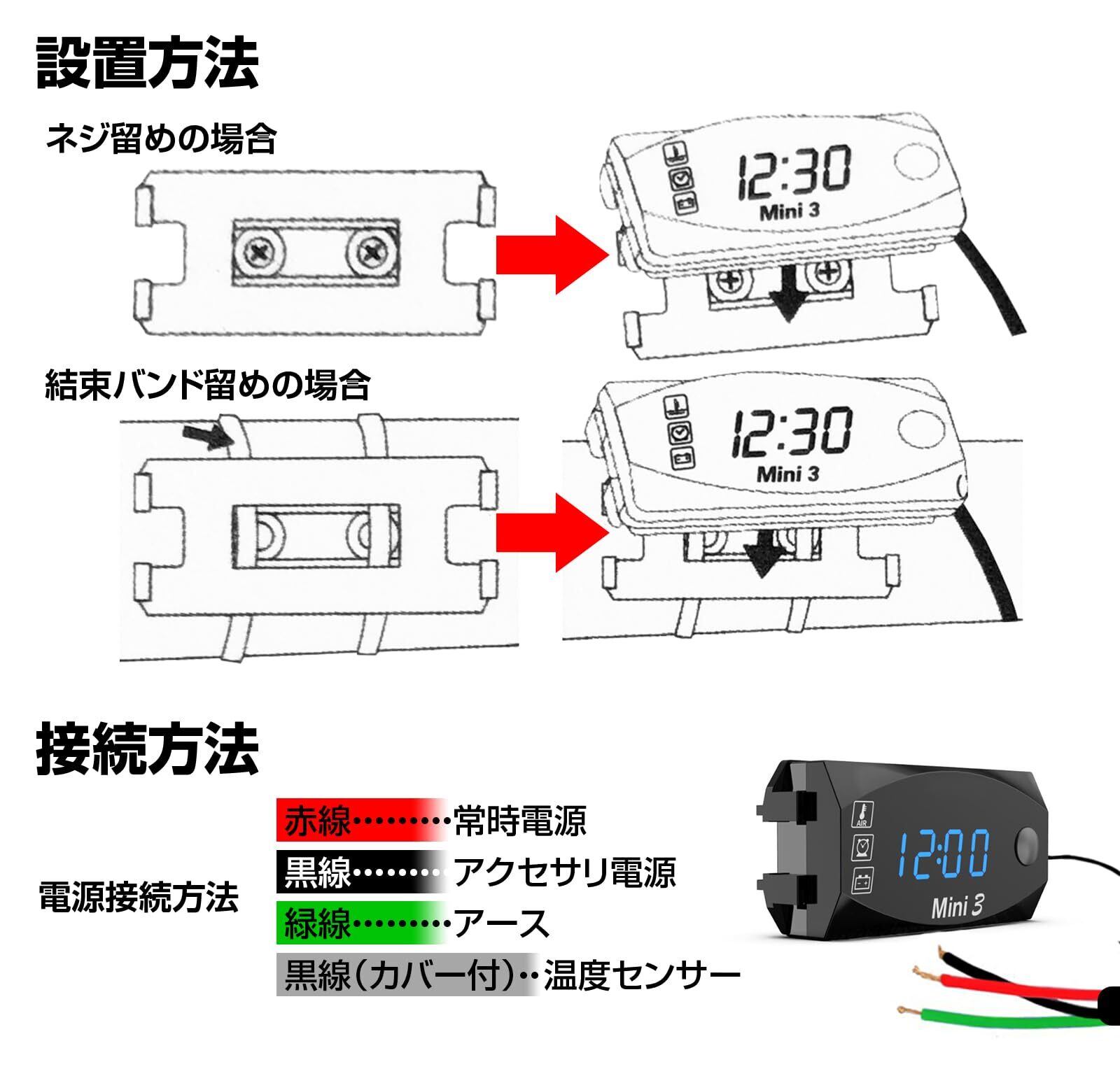 【電圧計/温度計/時計の機能を備えた、3in1の12Vバイク用デジタルメーター】 くっきり見やすいデジタルディスプレイで 視認性がよく安全性が高いバイク用デジタルメーター。 3つの機能が1つにまとまっているので、バンドル周りニスッキリ設置。防水仕様なのでアマの日も安心して使用可能。