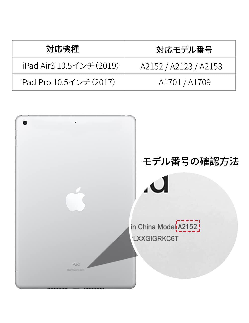 【対応機種】 iPad Air 3 (第三世代) 10.5インチ 2019 (モデル番号:A2152/A2123/A2153/A2154)、iPad Pro 10.5インチ2017 (モデル番号:A1701 / A1709) 専用スマートケース、カバー。 ご注意:iPad Air 1/ 2、iPad Pro 9.7、iPad Pro 11、またはその他のモデルには対応していません、ご注文の際に、お手元機種の背面にあるモデル番号を確認をお願い致します。