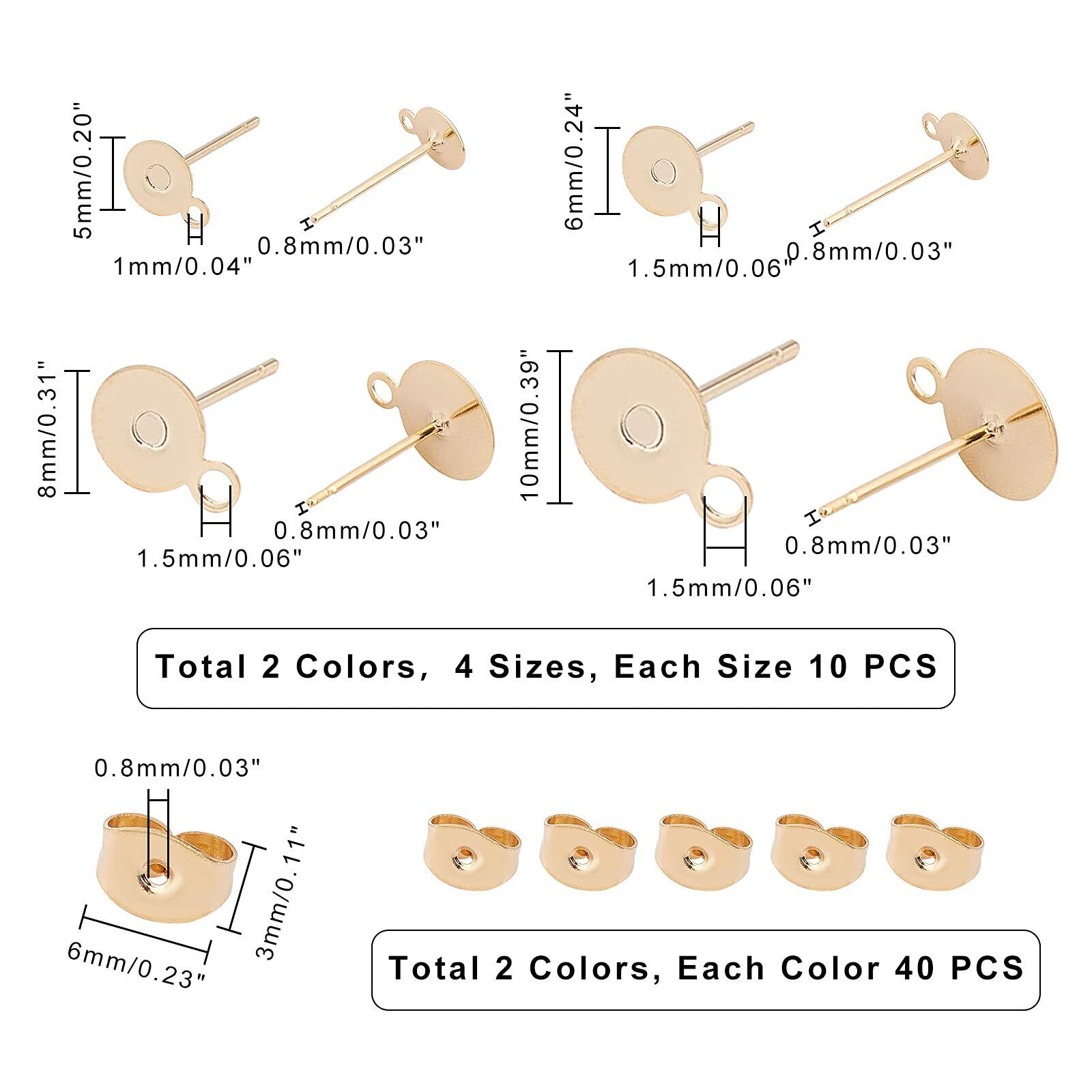 4サイズ:4つのサイズがあります5/6/8/10mmステンレス鋼フラットラウンドスタッドピアスの所見とイヤーナット; 各サイズ約20個, 合計約80個, 金色とステンレス鋼の色.