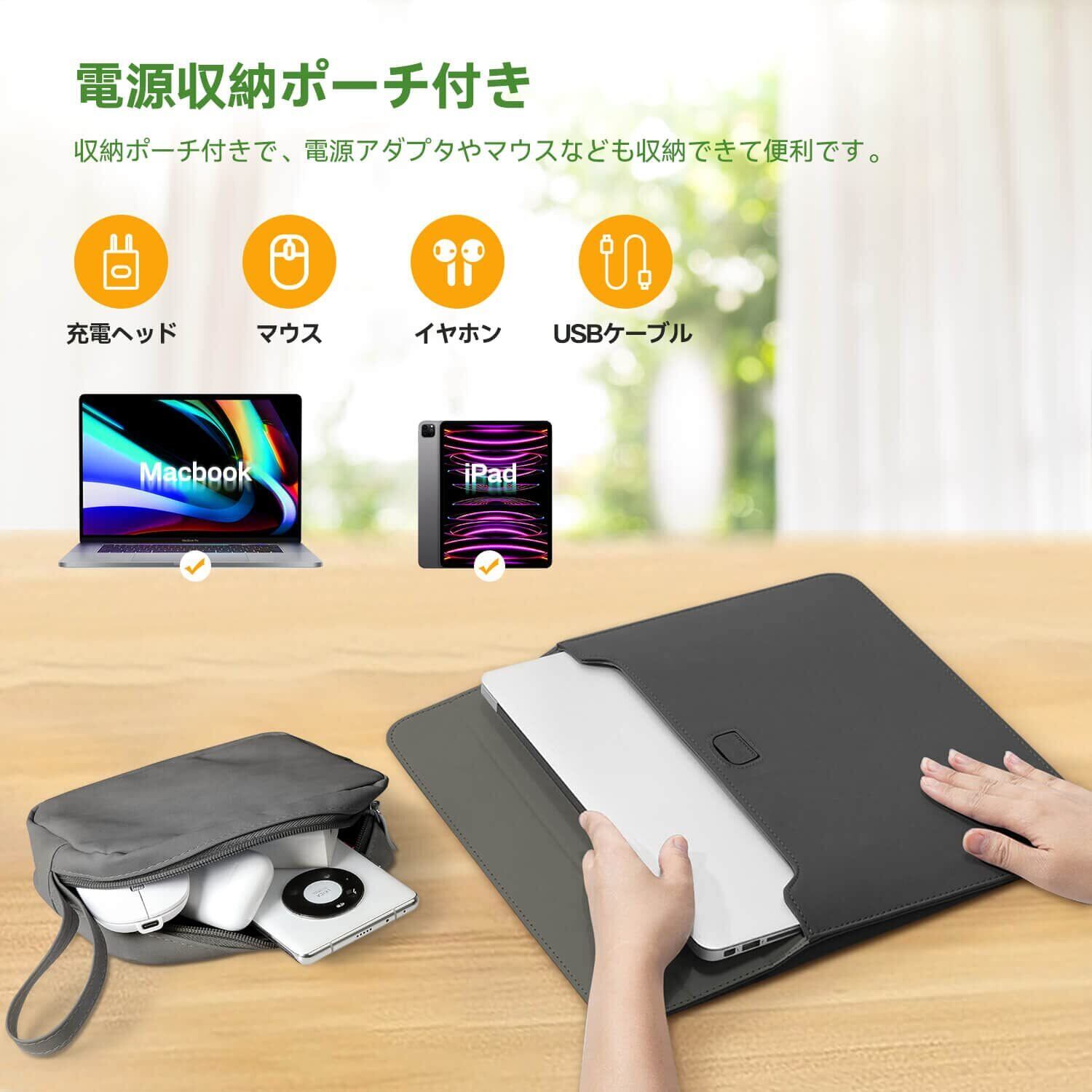 【収納ポーチ付き】高級感マイクロファイバー、スエードPUレザーと柔らかいポリエステル繊維層によって構成されています。アダプター、充電器、マウス、イヤホンなどの小物を収納できる収納ポーチ付き。外出時に便利です。