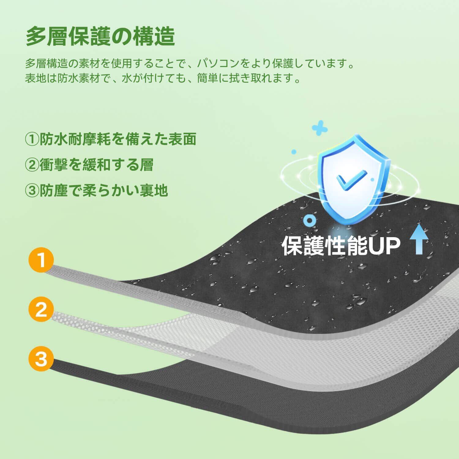 【優れた保護性能】ケースは3層の高品質な素材を使用し、厚手の生地と柔らかい毛織地で、傷の防止と衝撃吸収に優れています、ラップトップが傷つかないように保護します。商品の表面は水が浸透しにくい材質を採用し、水が付けても、簡単に拭き取れます。