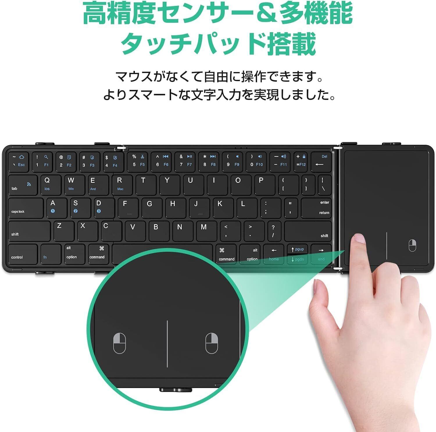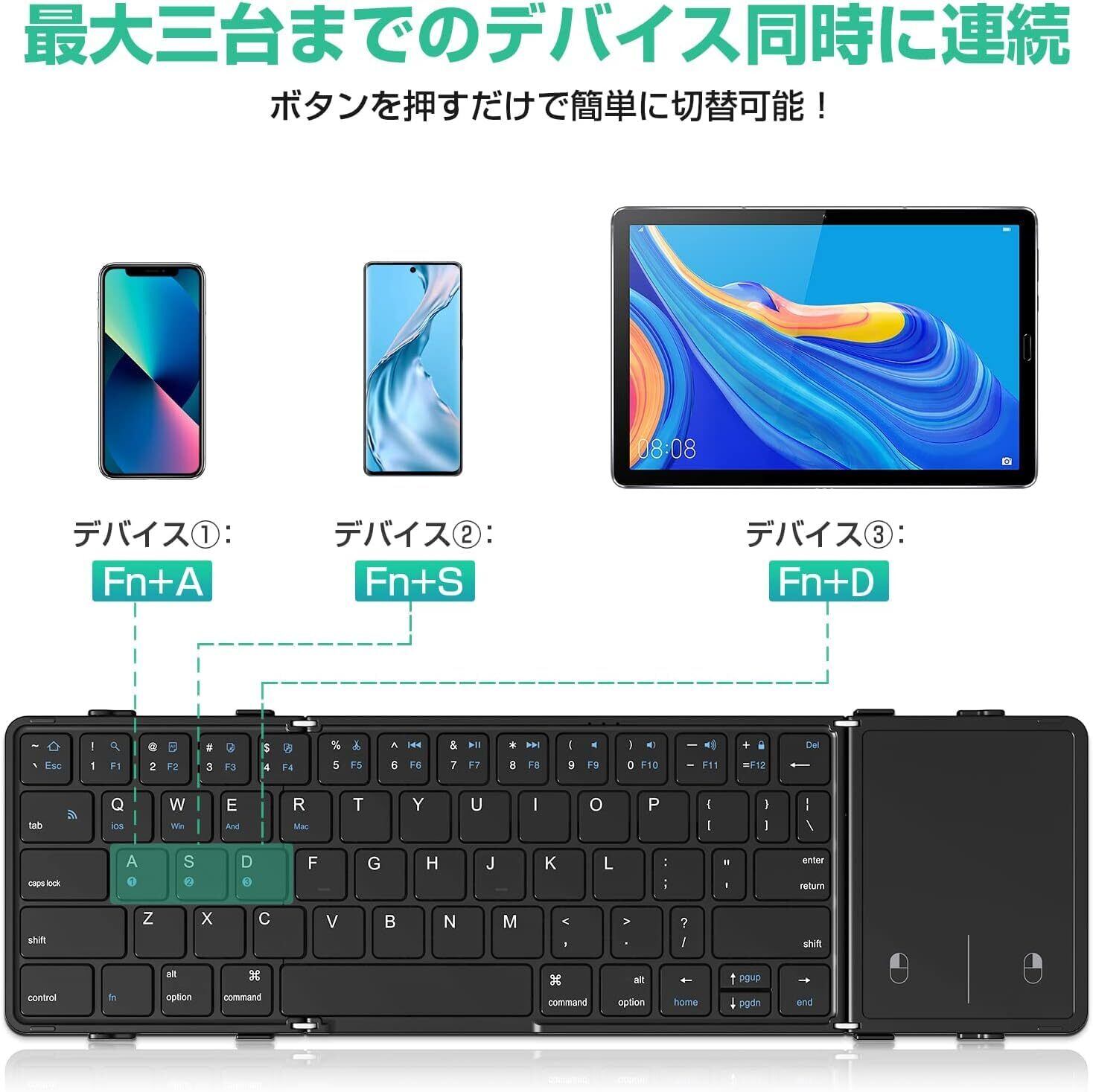 Bluetooth キーボード 折り畳み式 ワイヤレス 3つデバイス同時切替可能 フルサイズ タッチパッド搭載 無線 Type-C充電式 Windows/Mac/iOS/Android対応 パソコン タブレット スマホ用 静音 軽量 携帯便利 日本語説明書付き