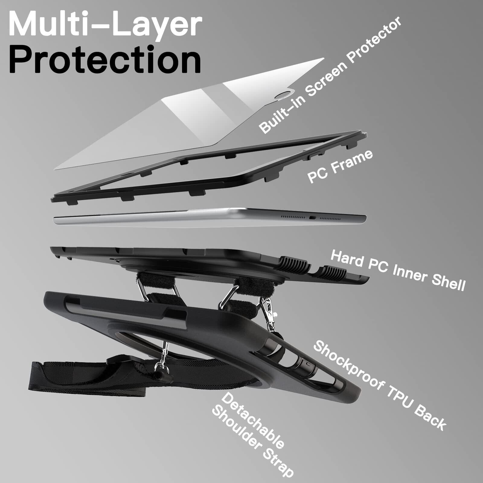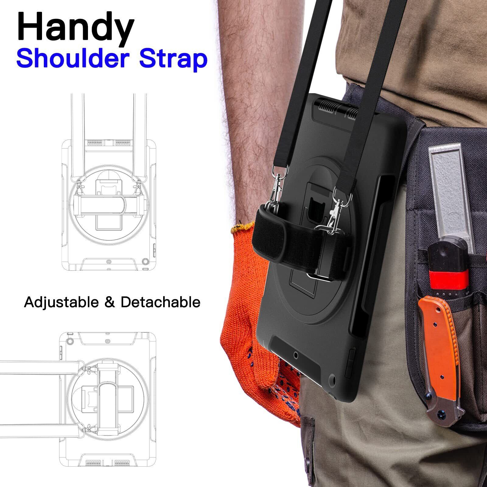 [着脱式 & 調節可能なショルダーストラップ] 自宅、職場、旅行先のどこにでも iPadを便利に持ち運べます。車のシートのヘッドレストの後ろに掛けて、共有して視聴することもできます