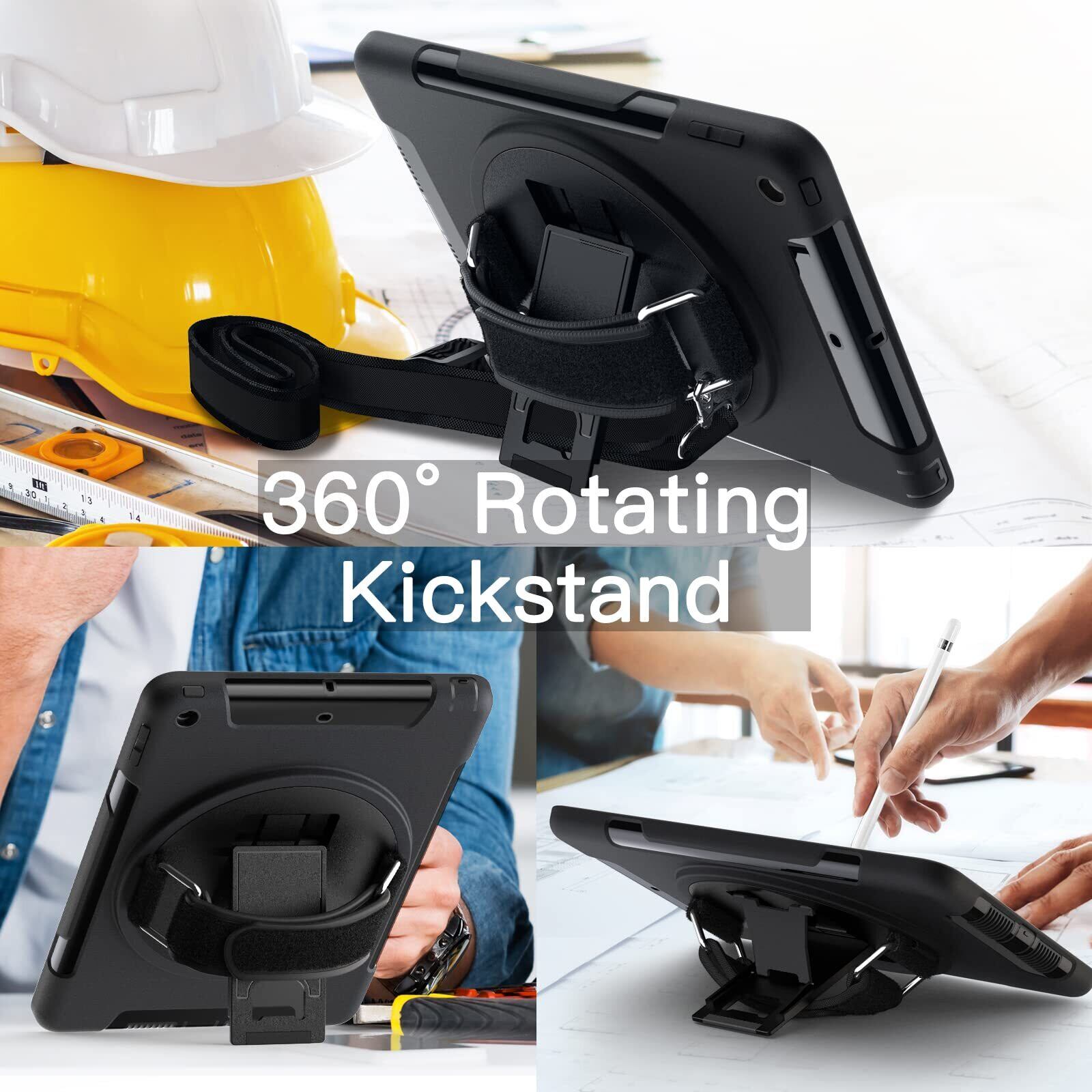 JEDirect iPad 9.7インチ ケース (第6/5世代、2018/2017モデル) 液晶保護フィルム付き 保護耐衝撃頑丈なタブレットカバー 360°回転ハンドストラップスタンド (ブラック)