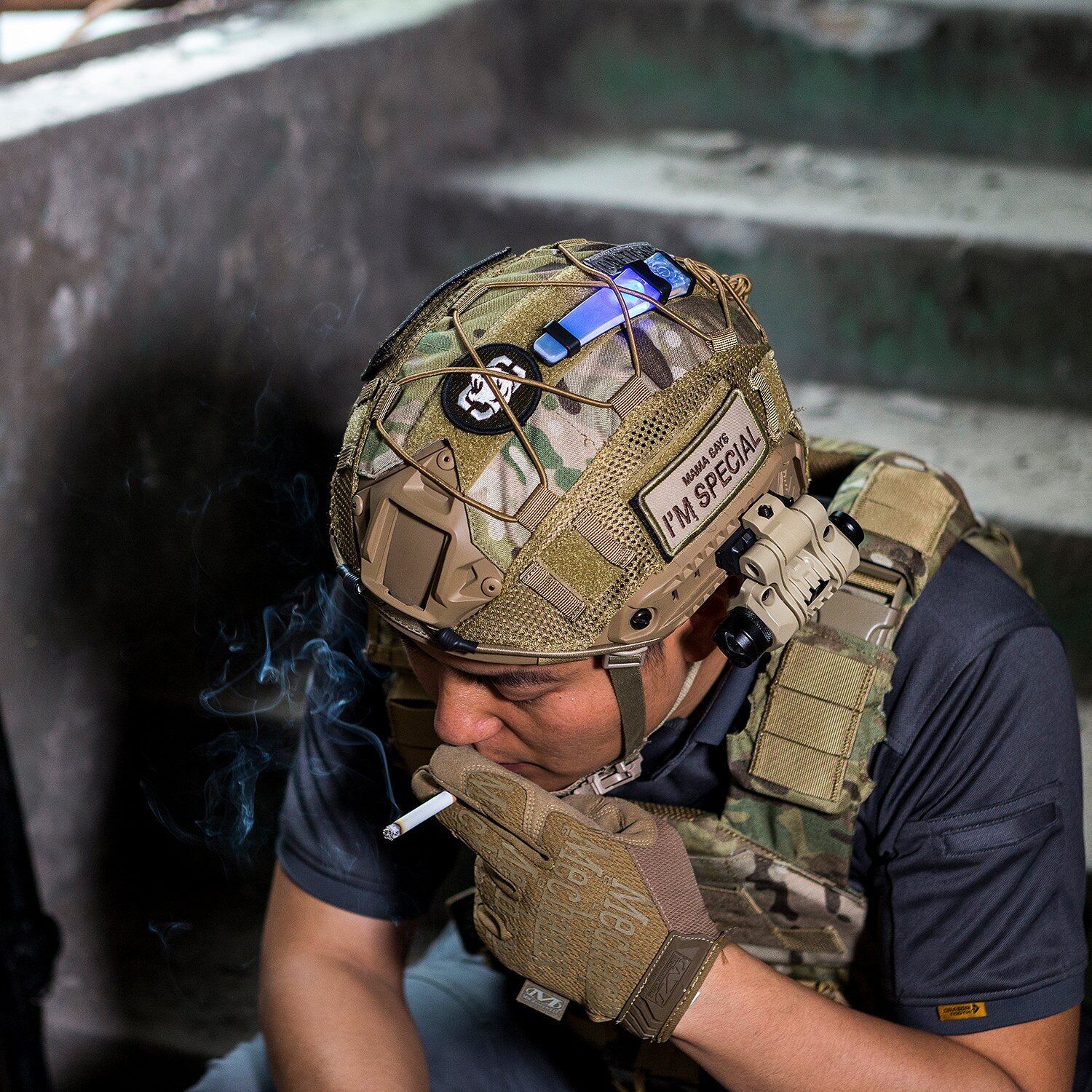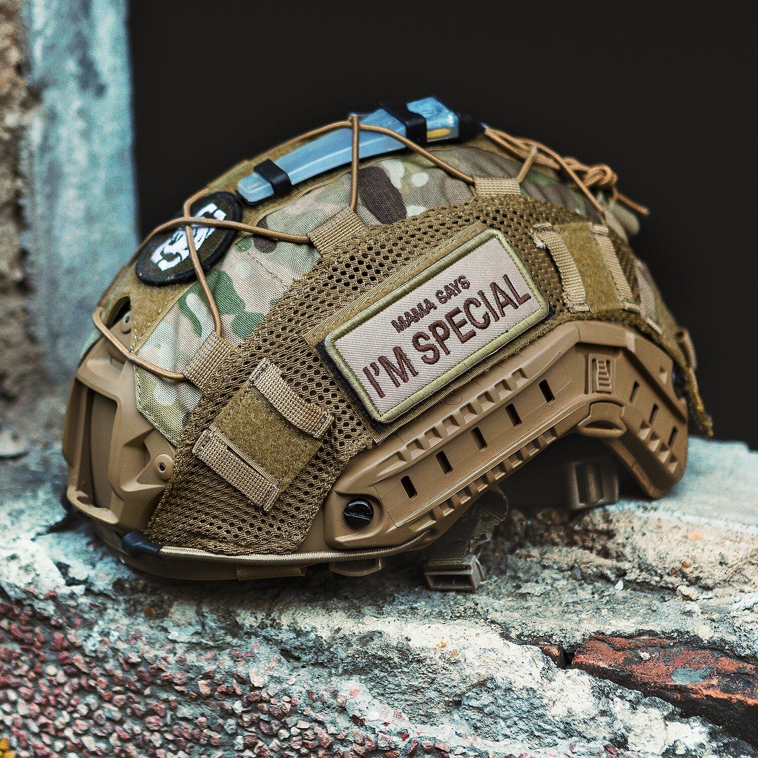 簡単な取り付け:MOLLE と面ファスナーシステム、クロスエラスティックコードにより、ヘルメットカバーをヘルメットに簡単かつ確実に装着できる。