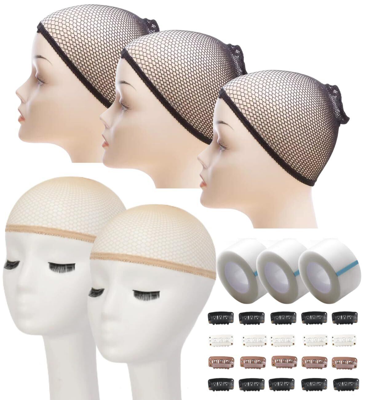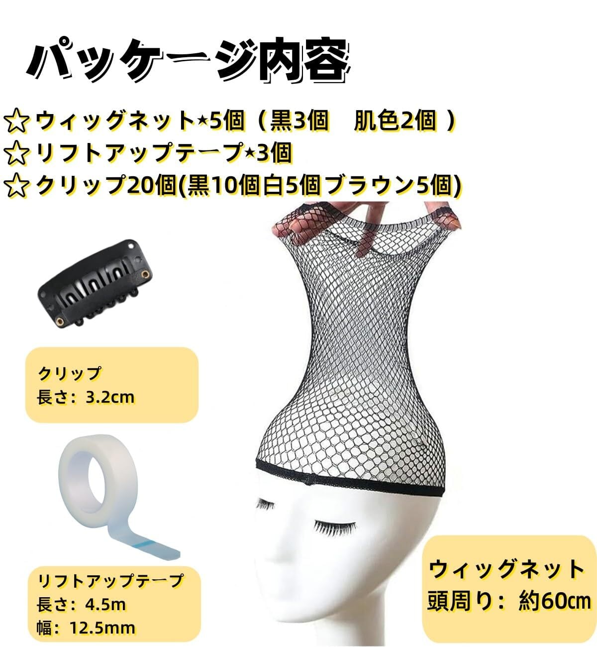 【内容】ウィッグネット 黒3個、肌色2個;ウィッグ固定用クリップ20個(黒10個+ホワイト5個+ライトブラウン5個)、リフトアップテープ3個。