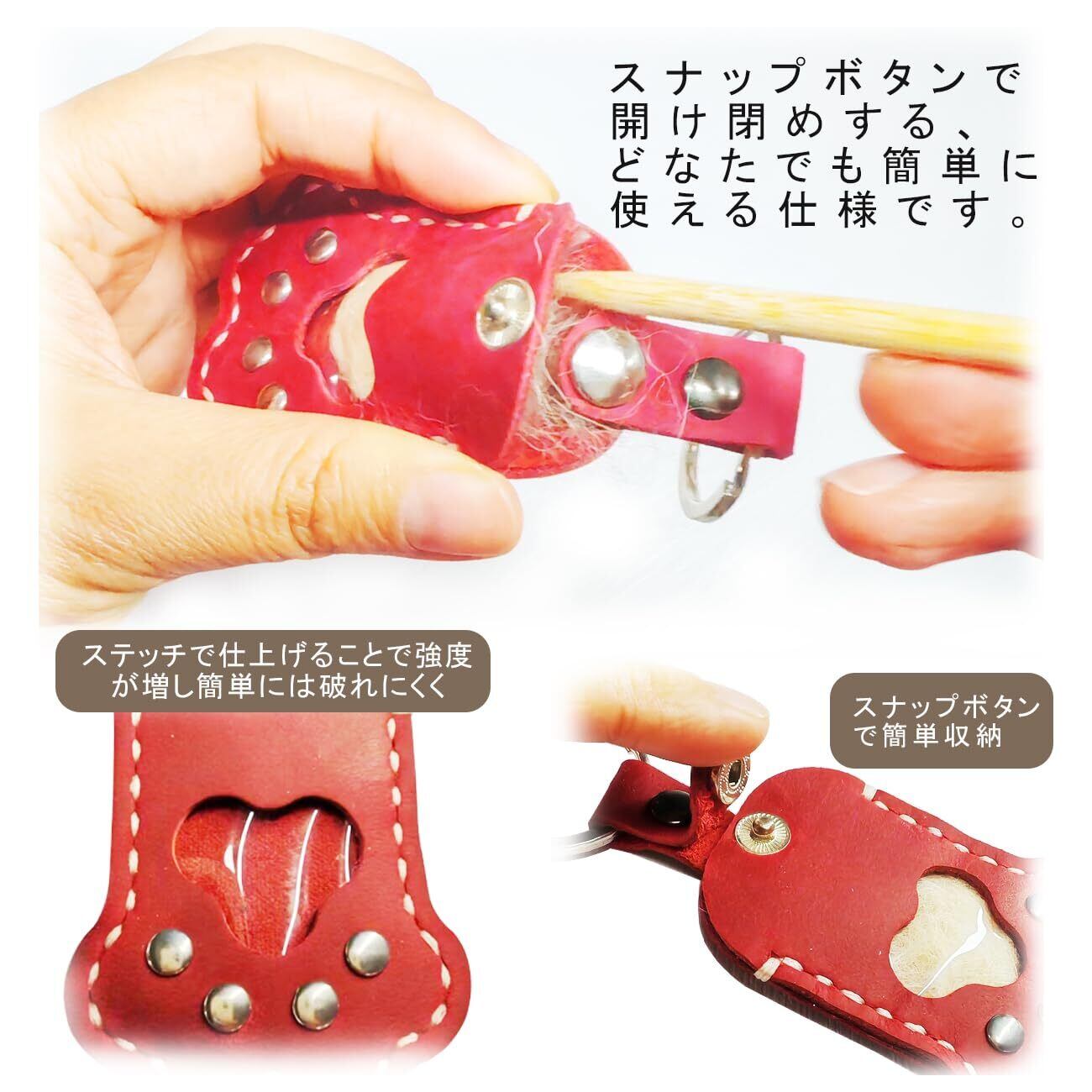 【1個1個ハンドメイドで作っています】生産牛革を肉球のカタチにくり抜き透明なPVC(フィルム)と重ねステッチで丁寧に仕上げています。ステッチで仕上げることで強度が増し簡単には破れにくく大切なあのコの毛も安心して納めておけます。