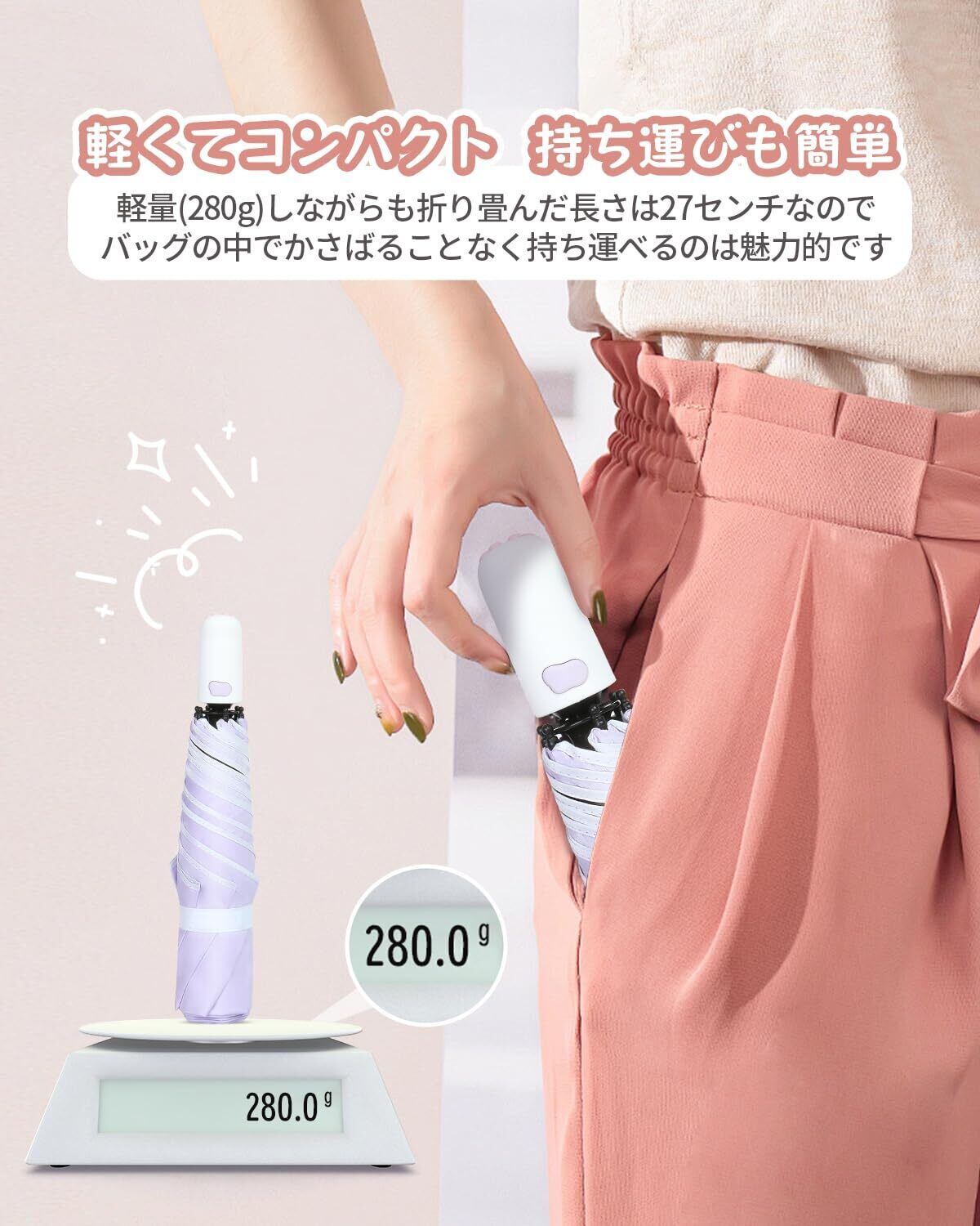 【ワンタッチ自動開閉 おりたたみ傘】この折りたたみ傘 ワンタッチで自動開閉する機能を備えています。車の乗り降りや片手しか空いていない時、ワンタッチスイッチを押すだけで、一瞬で傘の開閉が可能です。この折りたたみ日傘は軽い特徴もあるので、出張や旅行の際にリュックに忍ばせておくと便利な日焼け止めグッズです