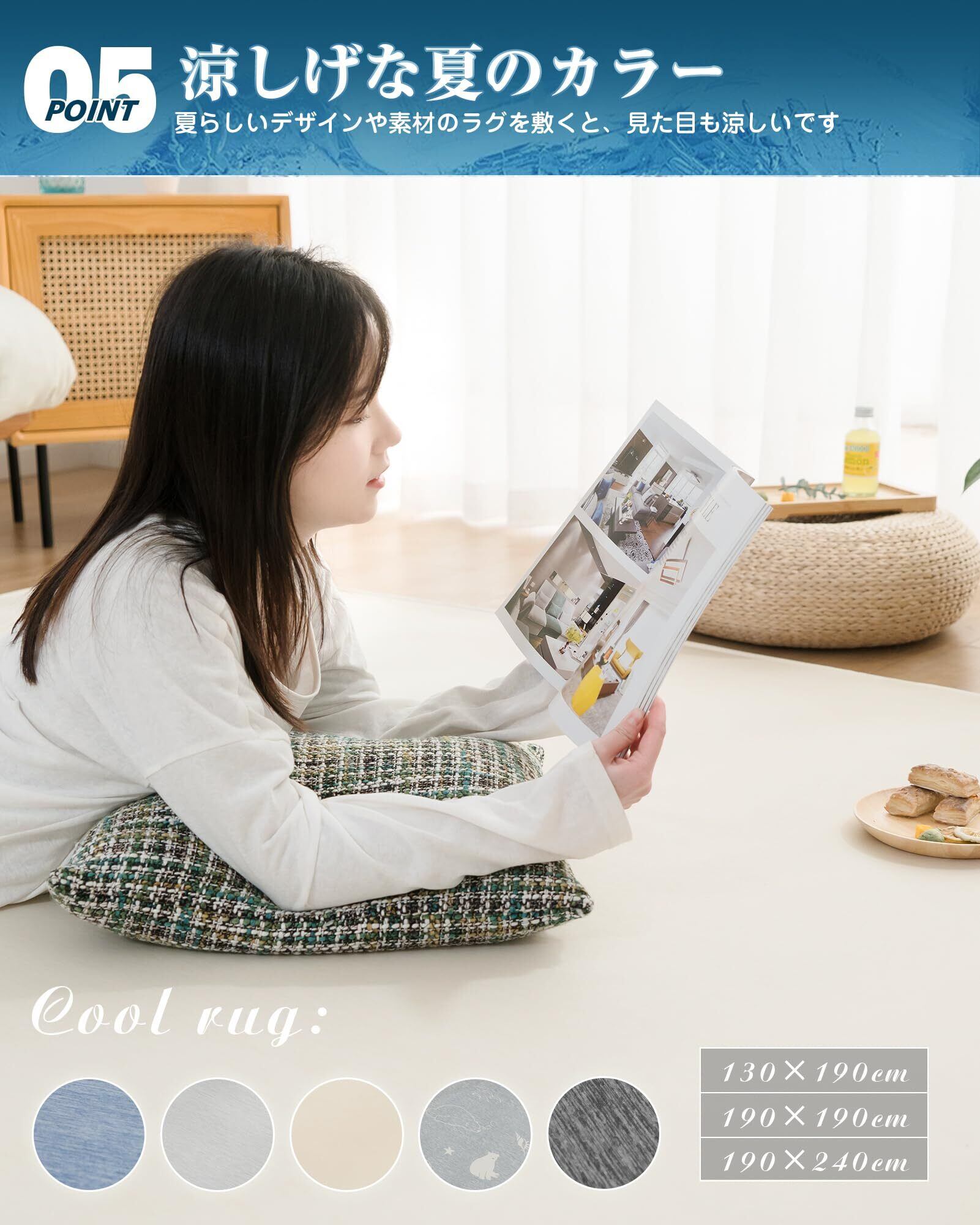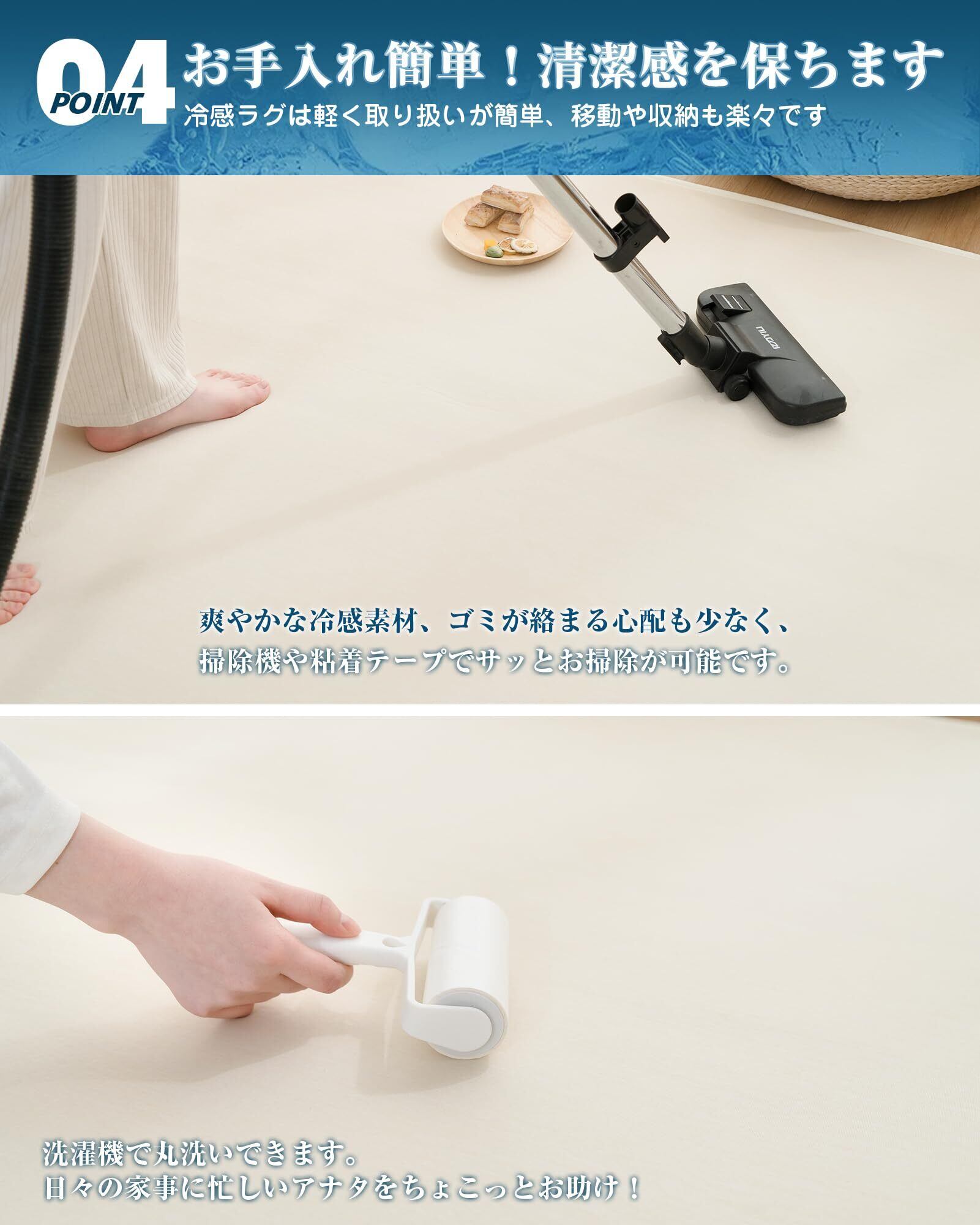 【掃除も楽々】冷感素材を使ったのでゴミが絡まる心配も少なく、掃除機や粘着テープでサッとお掃除が可能です。ご家庭の洗濯機でまるっと洗えてお手入れ簡単です。冷感ラグは軽く取り扱いが簡単、移動や収納も楽々です。