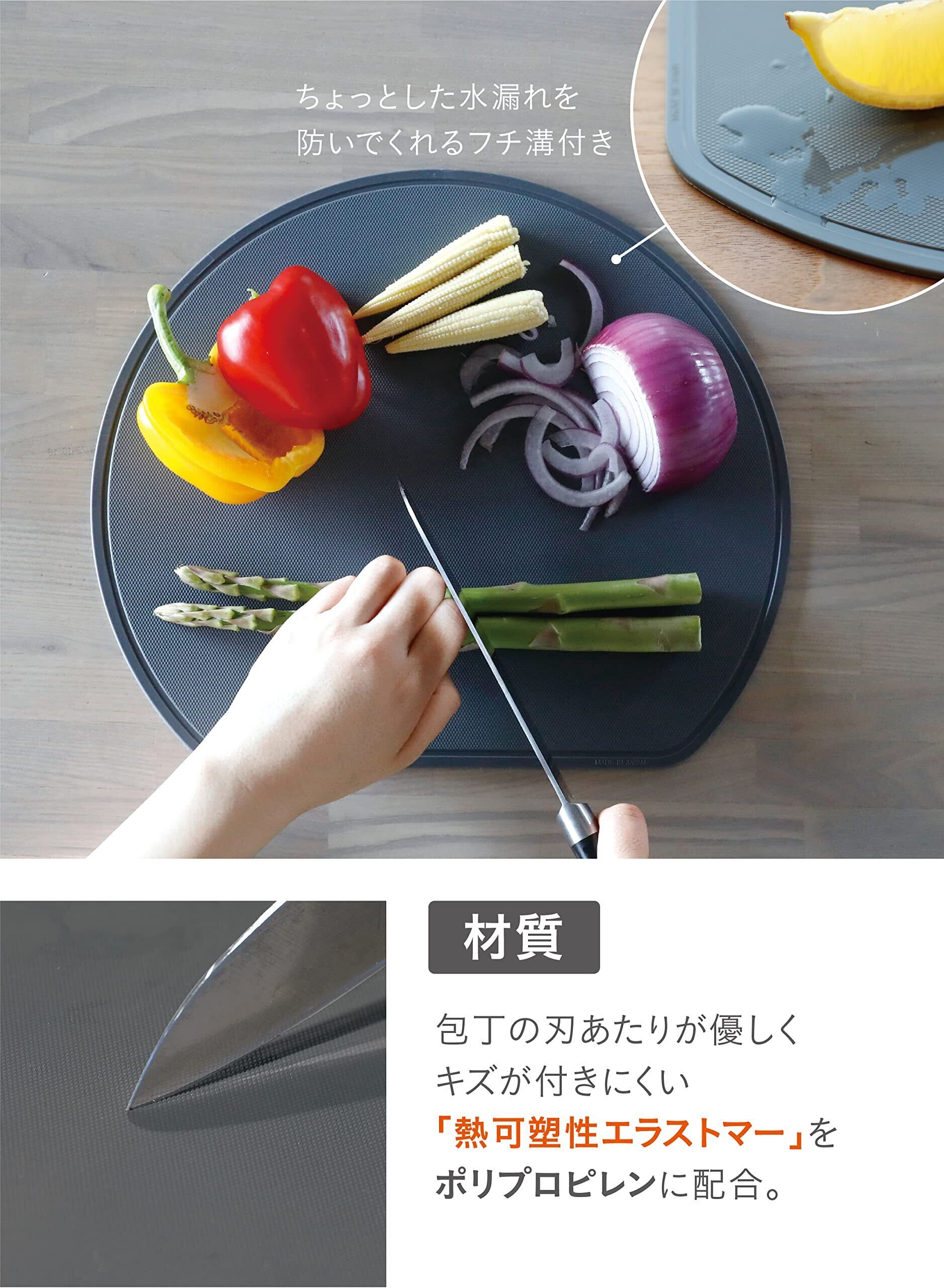 ポリプロピレンに「熱可塑性エラストマー」が配合されているので、適度な硬さと程よい弾力があるのが特徴。包丁の刃あたりが優しいので、食材が切りやすく刃こぼれを防ぎます。まな板自体にも深いキズが付きにくいので安心です。