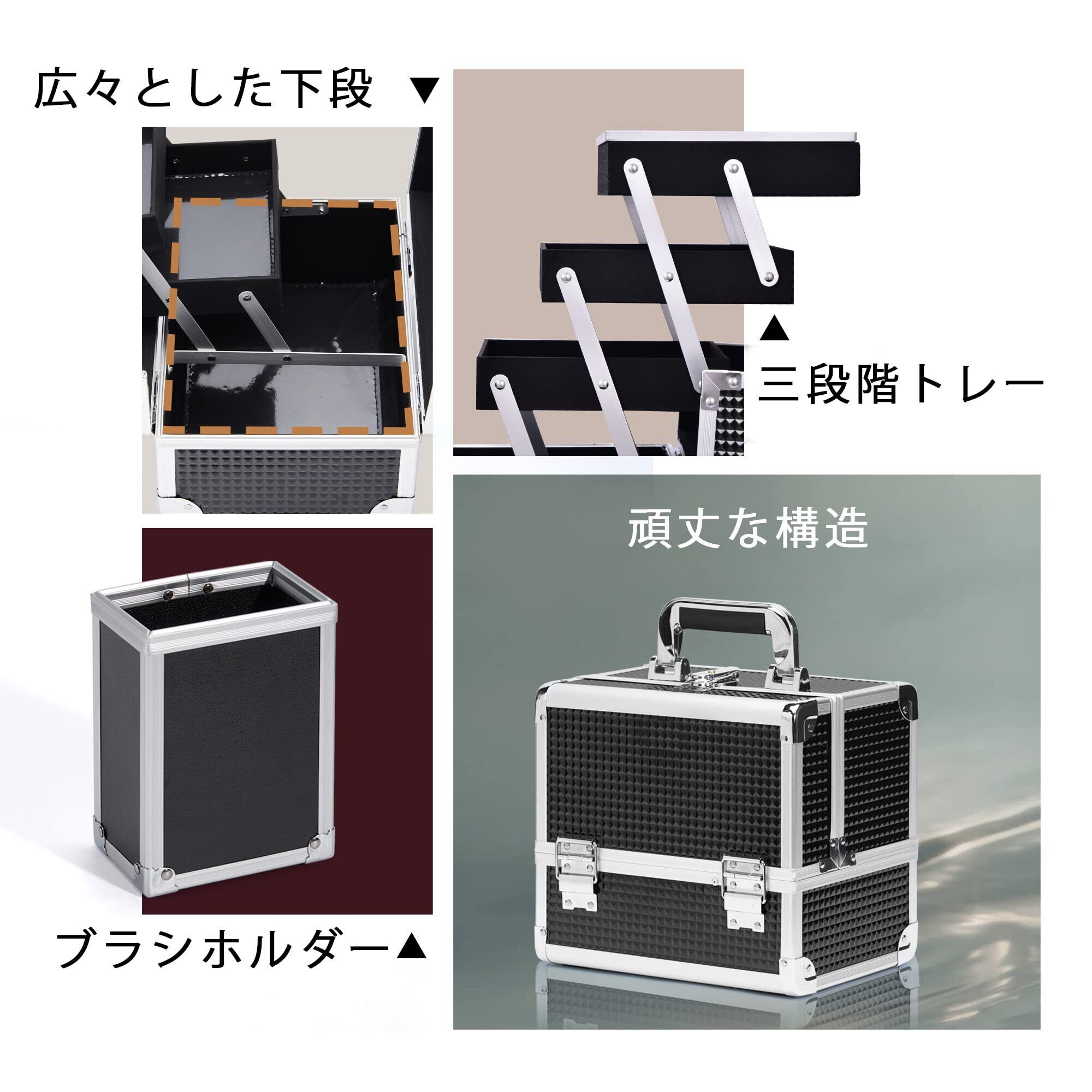 【収納力抜群】コスメボックスの3段式トレイとワイドな底部は整理がしやすい、細かいものを見やすく収納出来るだけではなく、右側にはブラシホルダーも収納可能のが魅力!プロ用メイクボックスとして、美容師・ヘアメイク・コスプレにも大活躍!