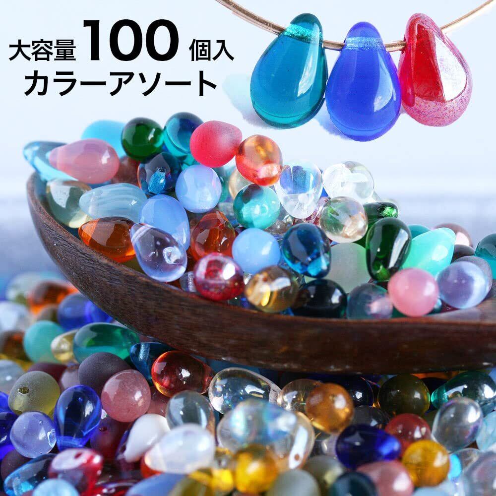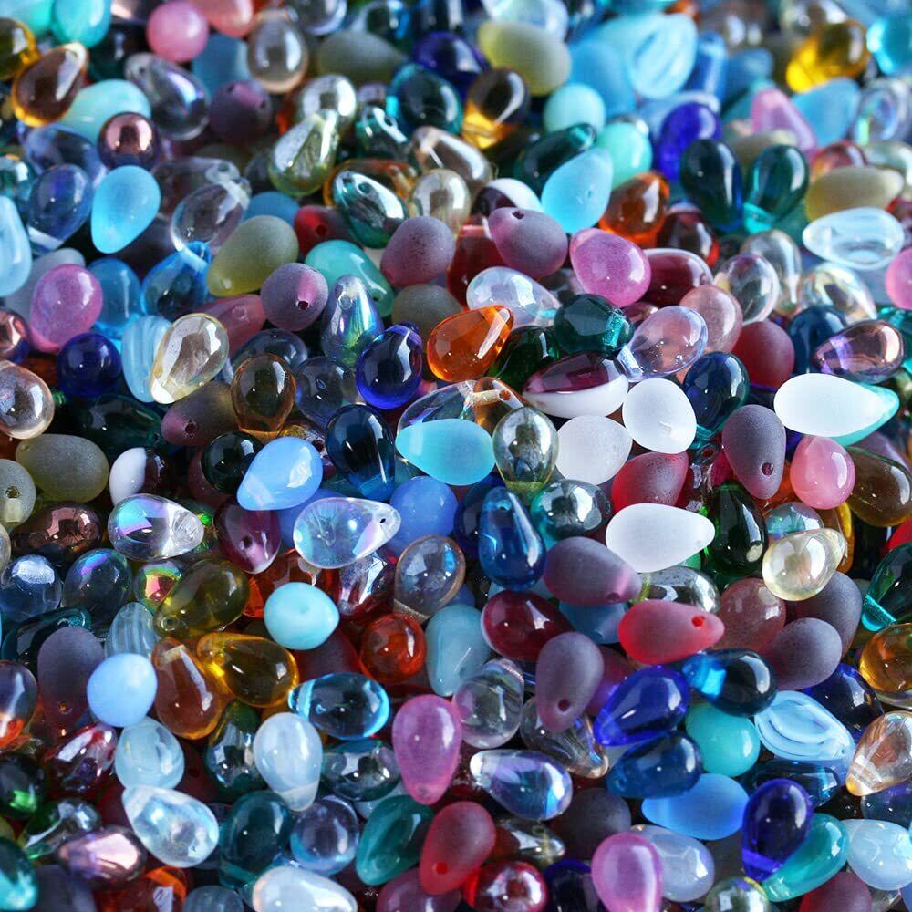 チェコガラスビーズのドロップ9×6mmおよそ100個をランダムカラーでセットにしたアソート商品