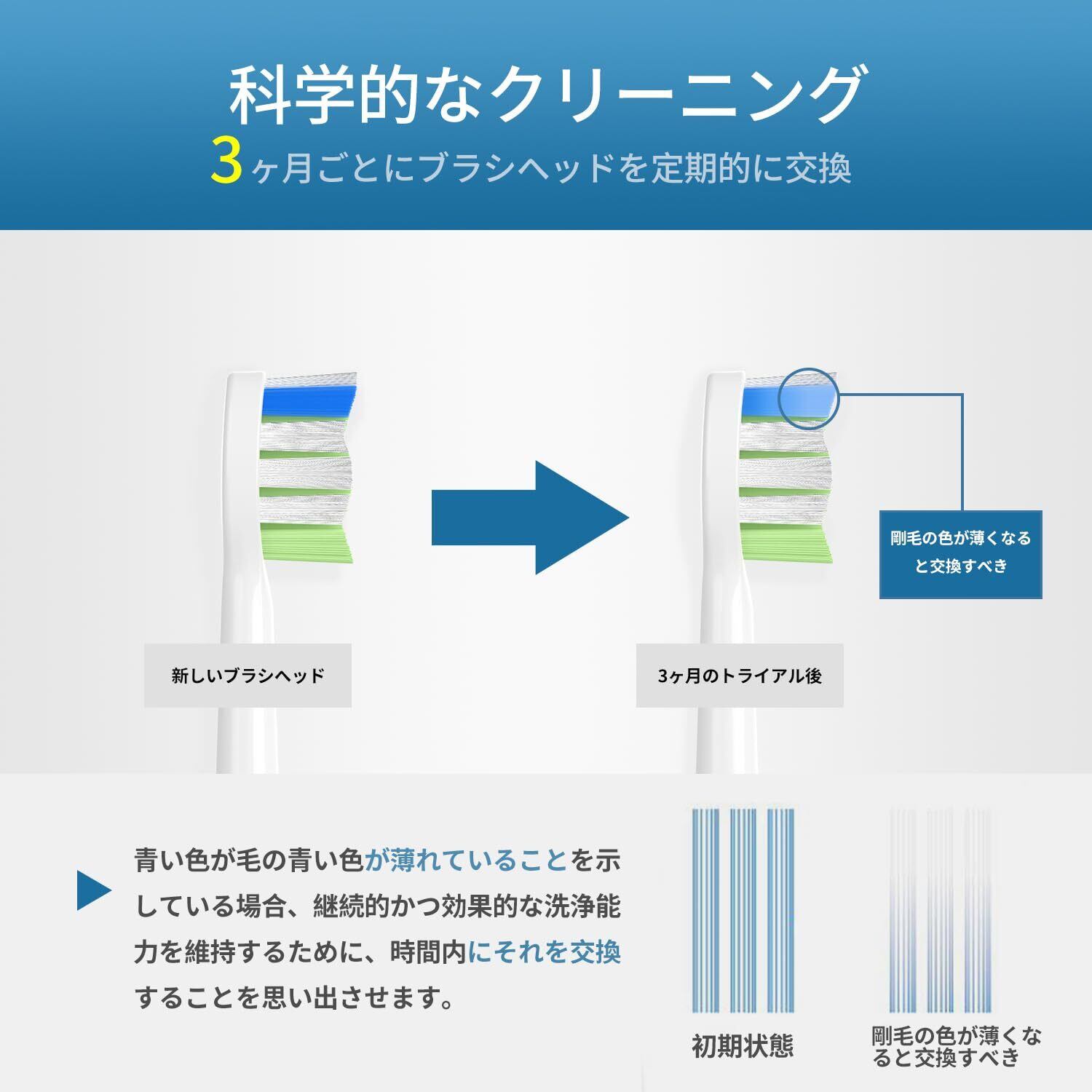 交換リマインダー:交換のタイミングがくると、ブルー毛が色褪せて白になって、貴方に交換を知らせます。3ヶ月以内に歯ブラシのヘッドを交換することをお勧めしています。 常にブラシヘッドを健康で効果的に機能できるようにしてください。