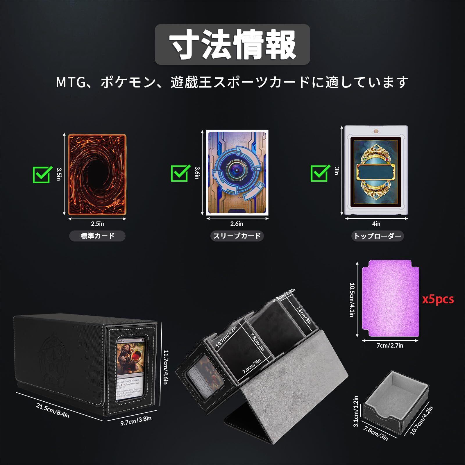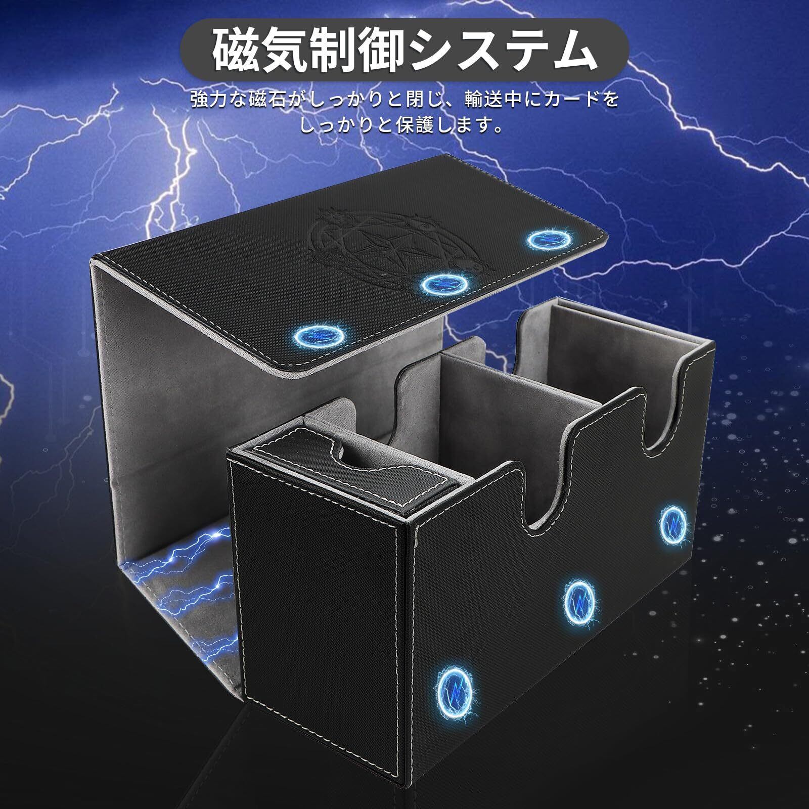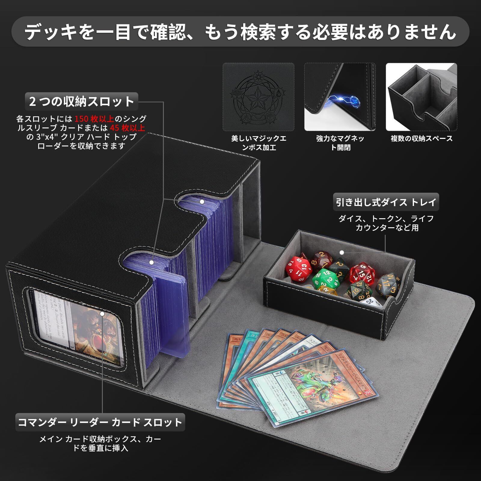 【多機能デザイン】こちらカードケース トレカカードだけでなく、2つの収納部を備えたデザイン性の高い多機能トレーディングカードケースです。スリーブなしカードを 500 枚、一層カード セットを 300 枚、二層カード セットを 250 枚収納できます。 また、ダイス、カウンター、コイン、その他の小さなアクセサリーを保管するための引き出し式引き出しも備えています。 複数のデッキを同時に保管するのに最適で、コマンダーおよびスタンダードデッキのプレイヤーに適しています。コマンダーおよびスタンダードデッキのプレイヤーに最適です。