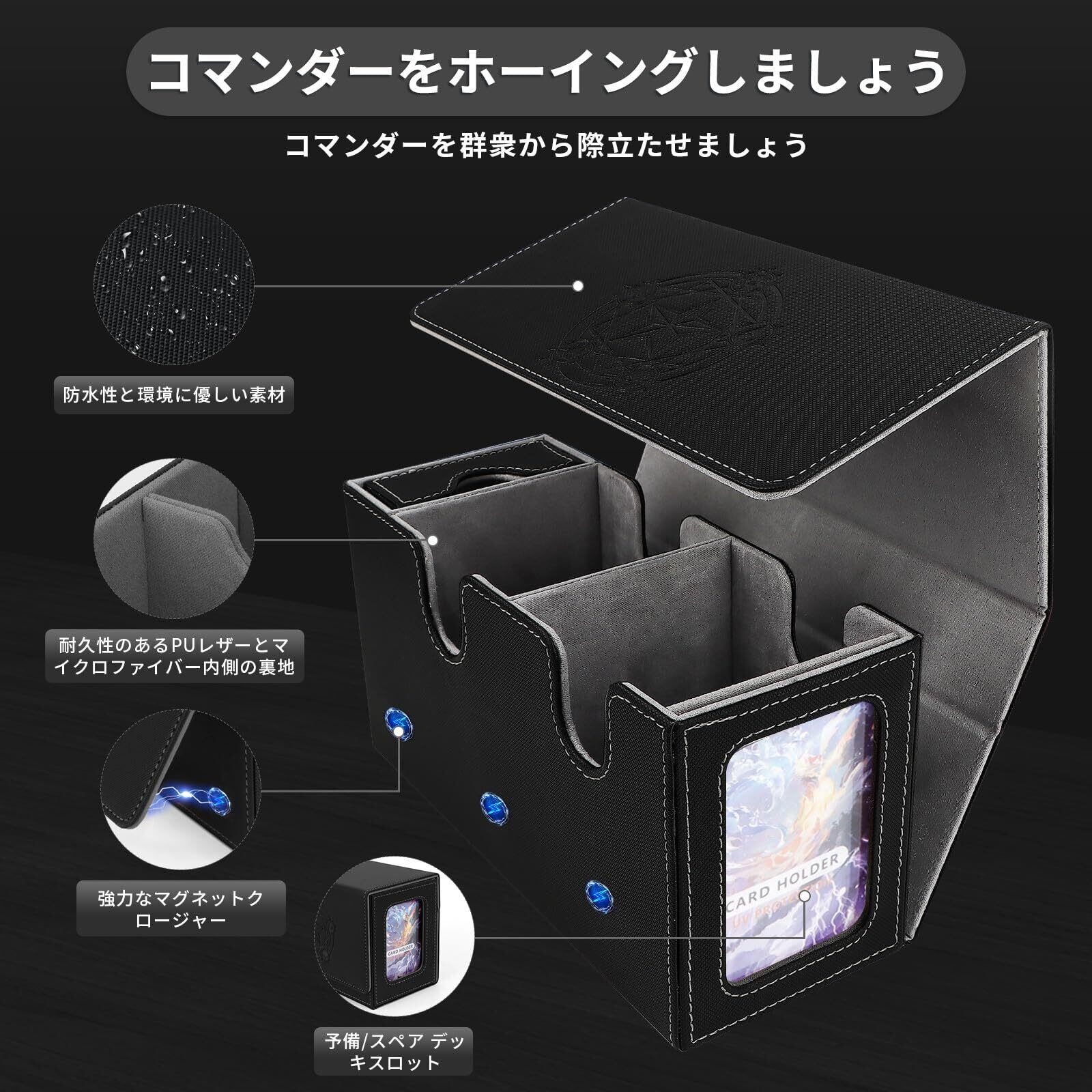 【デッキ収納ソリューションのアップグレード】デッキボックスアップグレード イノベーション ウィンドウは、コマンダー EDH プレイヤー向けに特別に設計されており、コマンダー デッキに合わせてカスタマイズされています。 コマンダー/リーダー カードを付属の 35PT 磁気カード ホルダーに安全に保管し、特別に設計されたカード スロットに表示します。このユニークな機能により、各カード ホルダー内のデッキをすばやく識別できます。