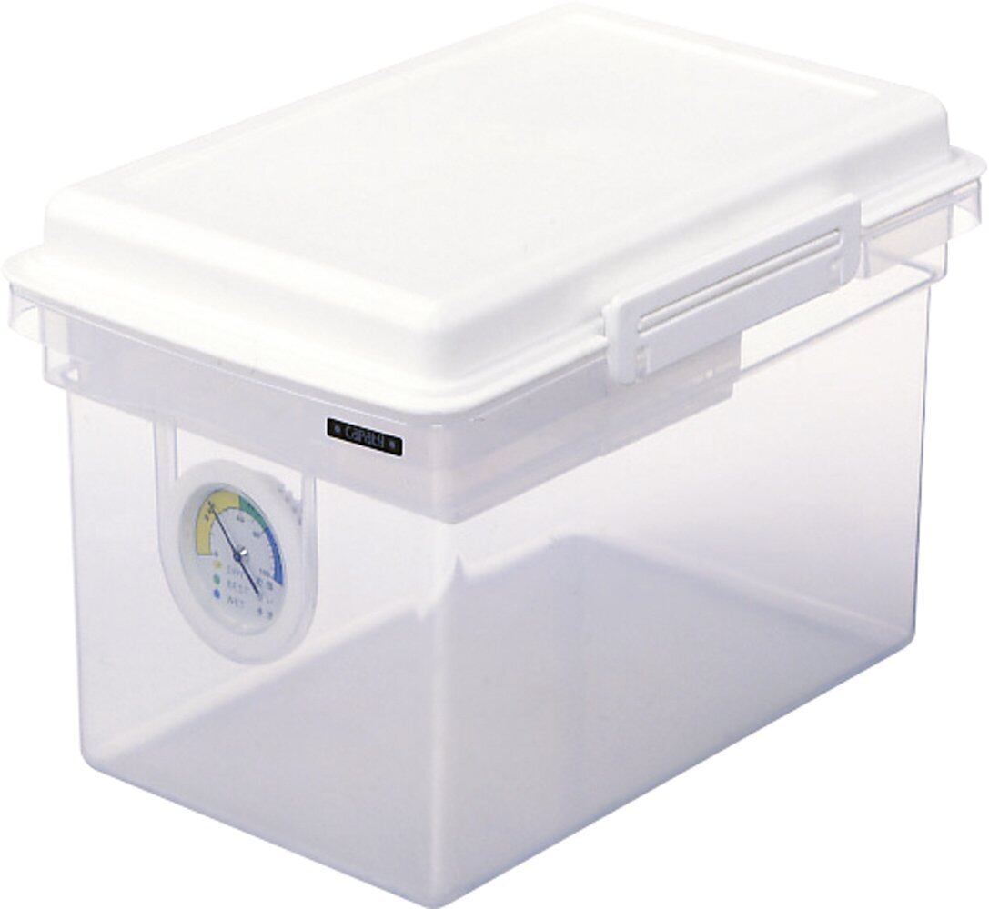 ●湿気シャットアウト。フタの周囲は発泡ポリエチレンやシリコンゴムを使った密閉方式。乾燥状態が一目で分かる湿度計と乾燥剤付き。中身が見えるクリアボディでスタッキングもOK