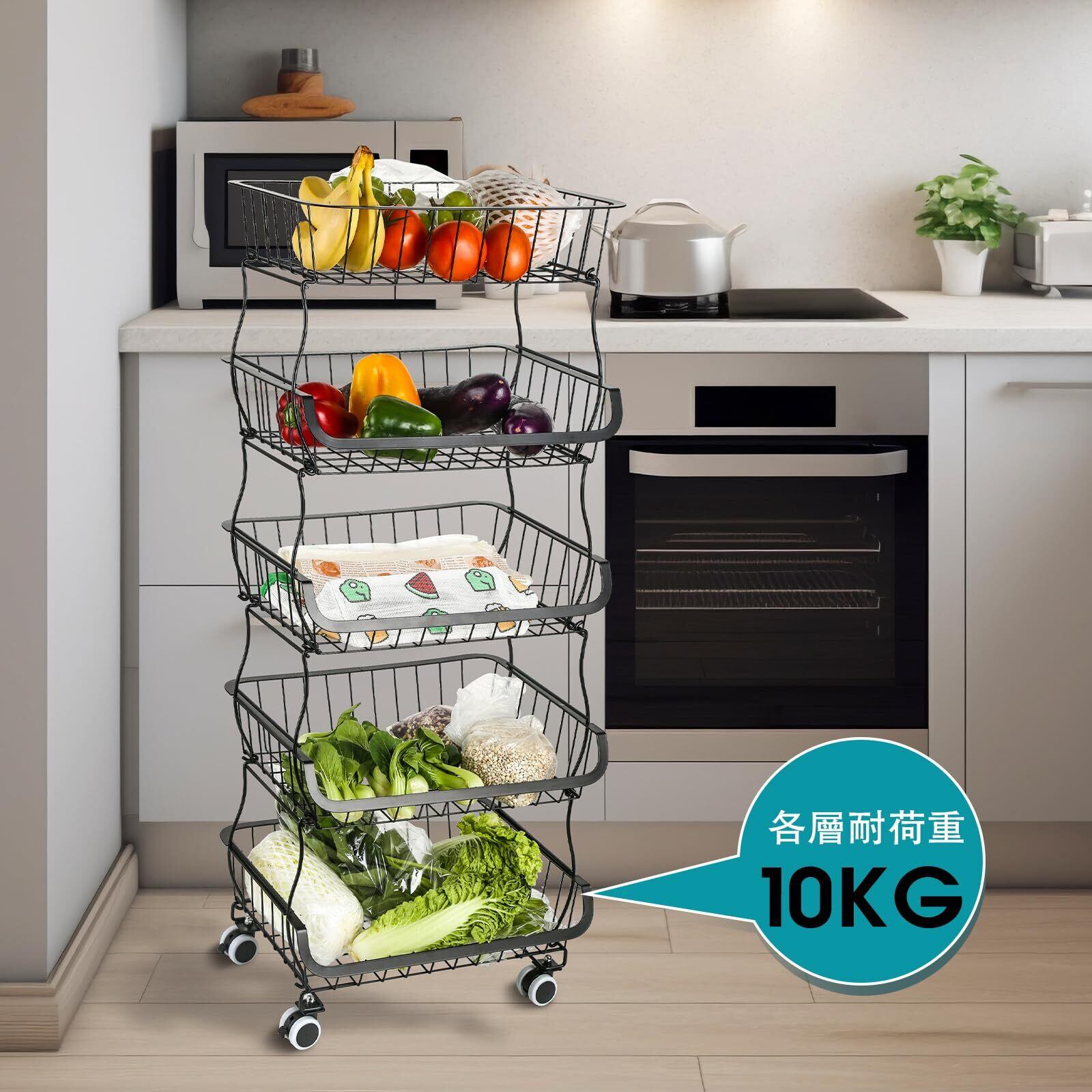 【自由に組み立て、幅広く使える】本製品はスタッキング式なので、お好みで1段から5段まで自由に組み立てられます。またはバスケットを一個一個を分けて収納ボックスとして、食器、調味料、食材、台所の小物などの収納にも適用します。使い方はアイディア次第です。