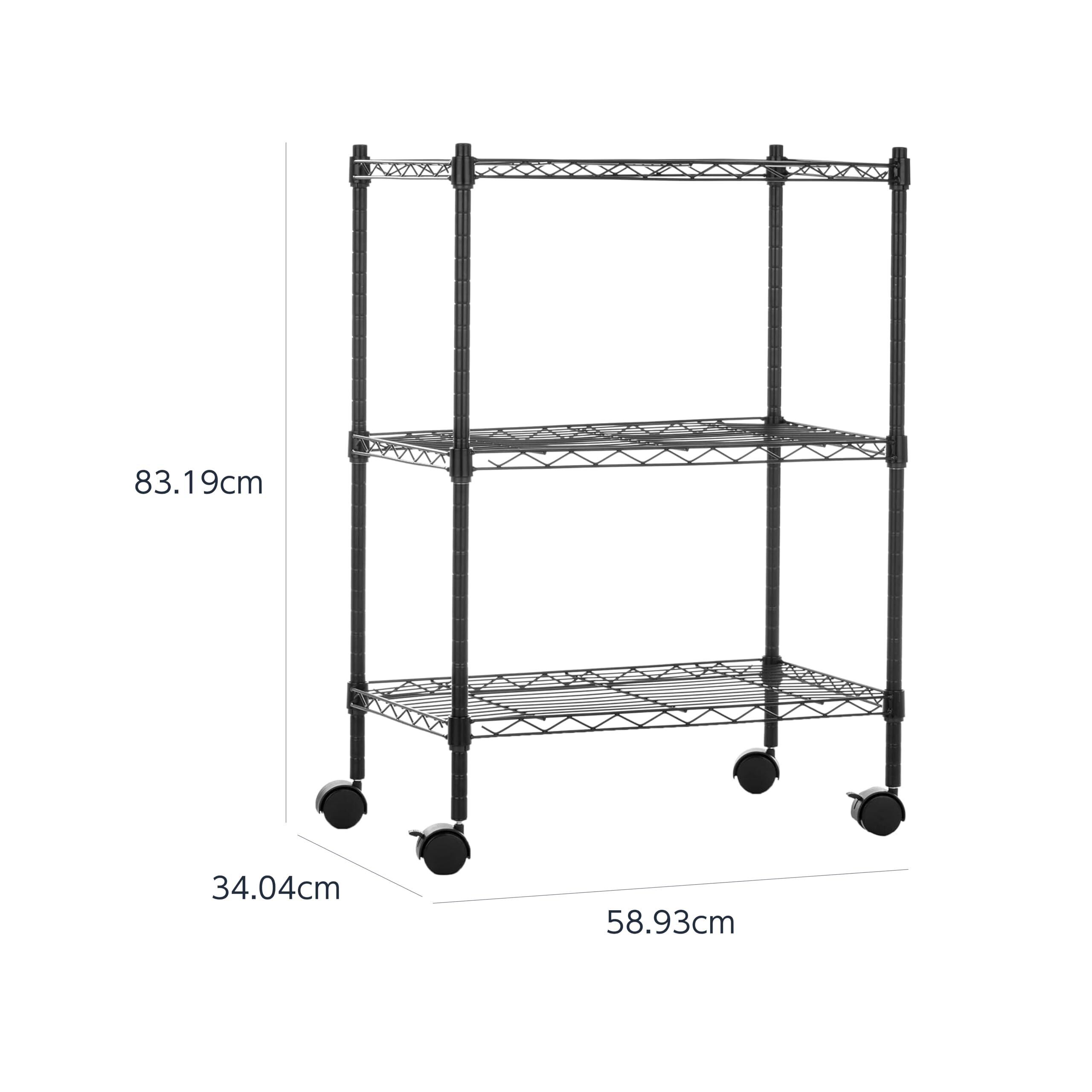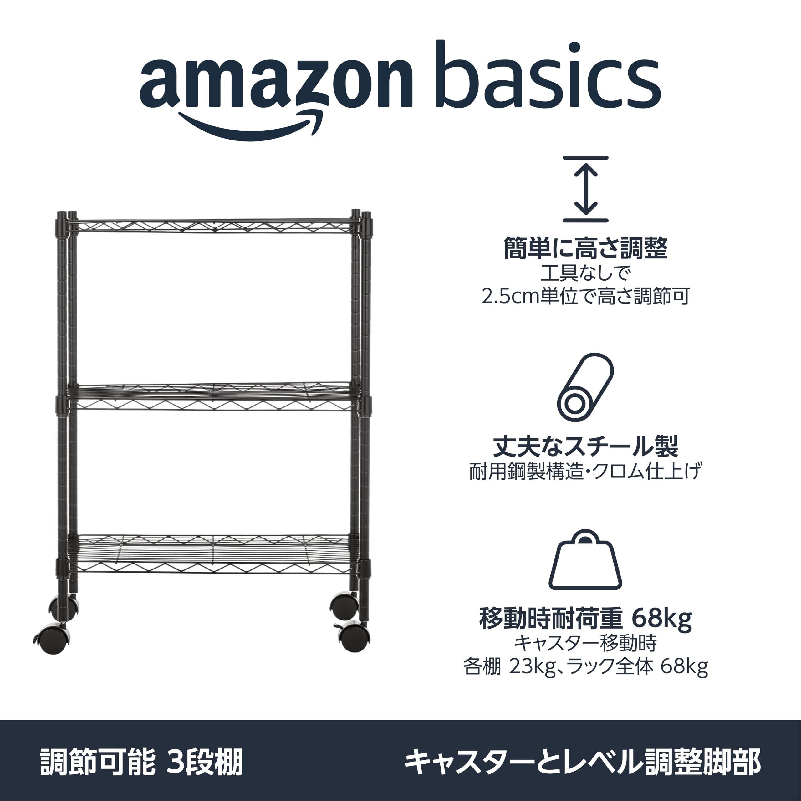 Amazonベーシック 3段スチールラック 棚 メタルラック キッチンラック キャスター付き 耐荷重68kg 幅58.9×奥行34×高さ83cm ブラック