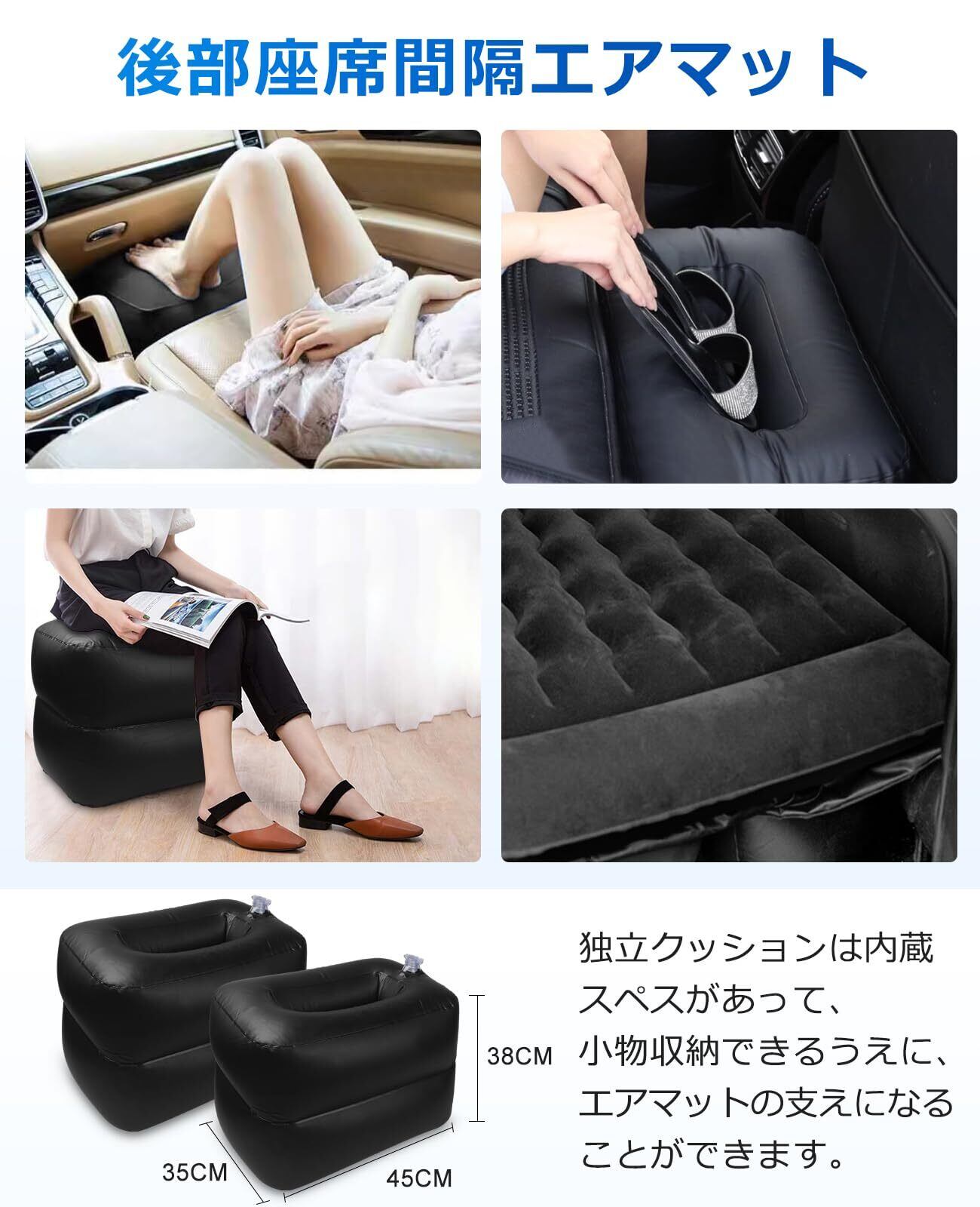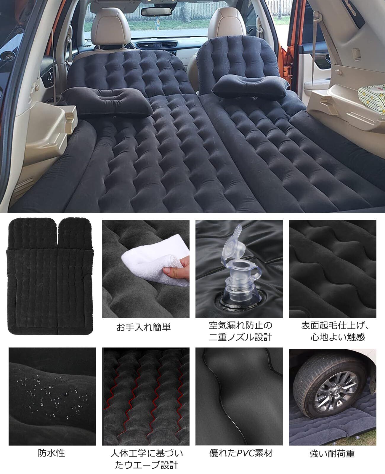 優れたクッション性:車の凹凸や傾斜をカバーしてくれる厚さがあるため、すき間や段差を埋めて睡眠しやすい環境を作れます。長時間寝転んだ場合の腰への負担を軽減します。空気量で厚さを変えられるもでるなので、お好みのフィット感に調整できます。