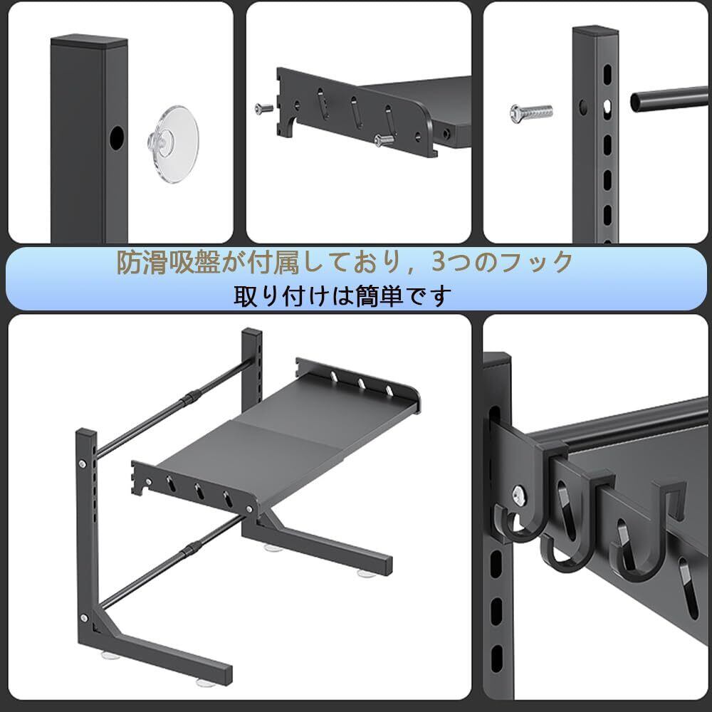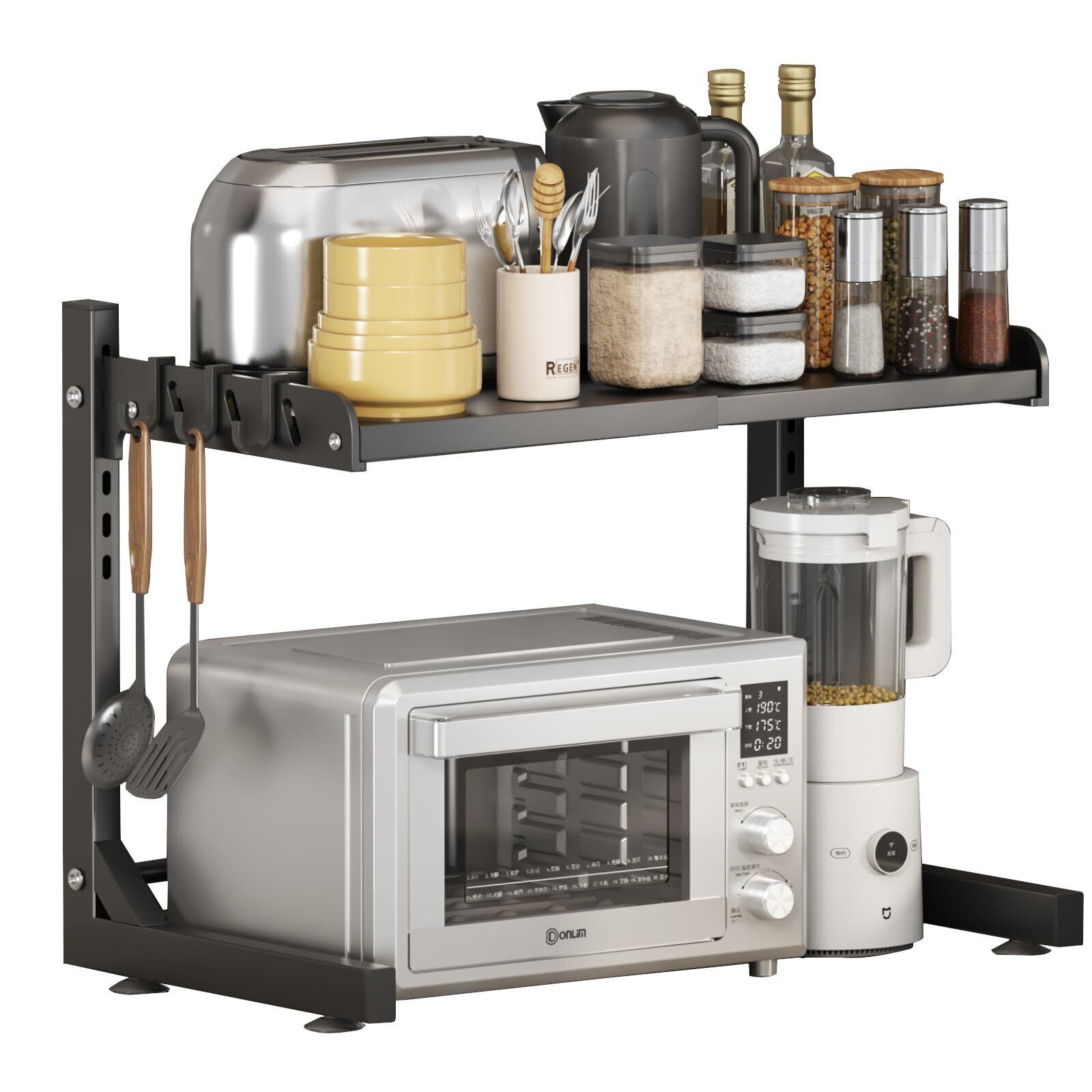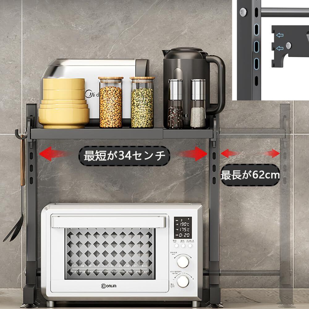 レンジ上ラック 電子レンジラック レンジ台 トースターラック オーブンレンジラック キッチンラック シンク上キッチン収納ラック 伸縮式幅(34-60) 棚板高さ調節可 耐荷重30kg 耐熱 防蝕防錆 フック3-つ付き (ブラック)