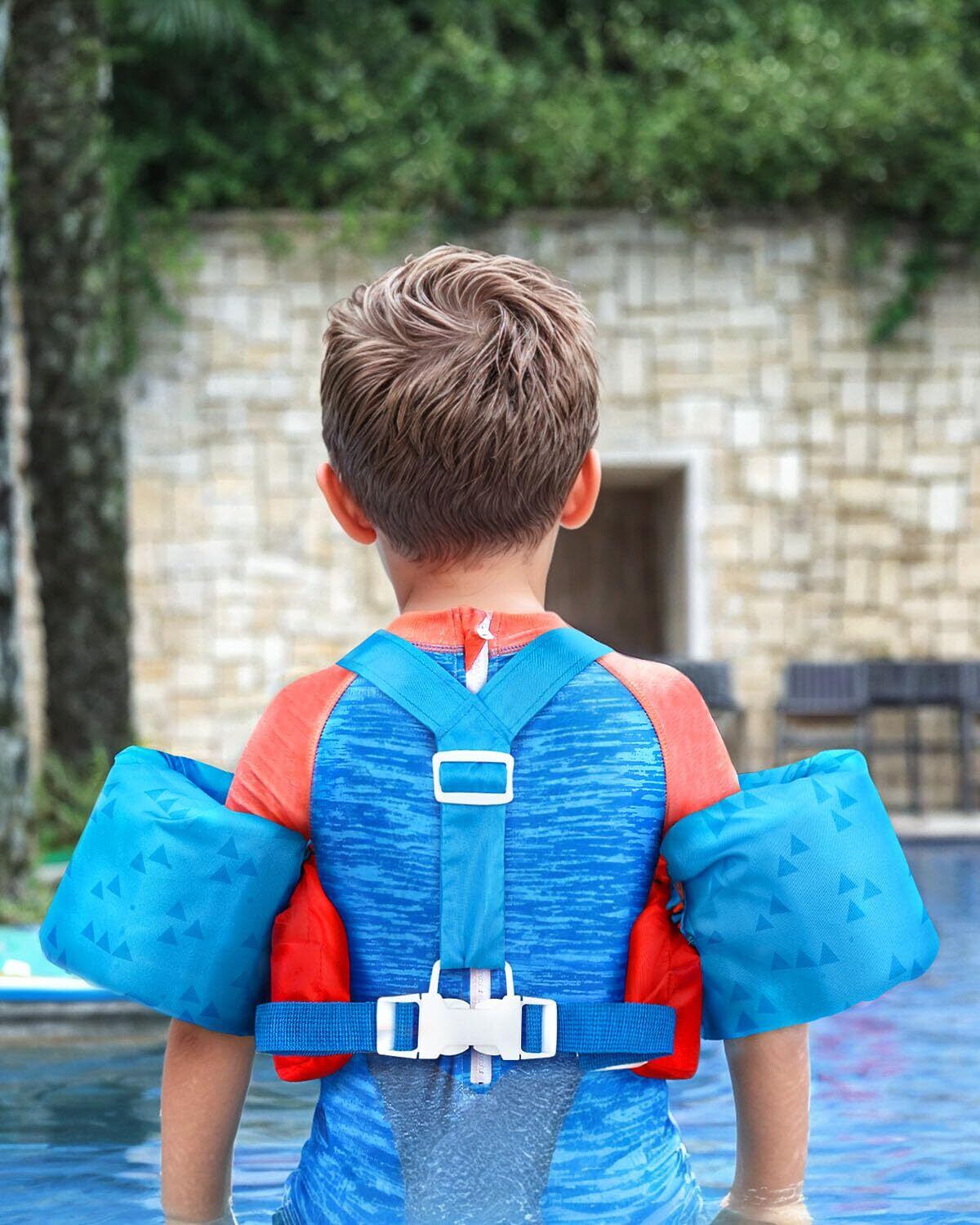 【使いやすさ】腕を通して、簡単にバックルで装着可能。お子様も嫌がらずに付けてもらえます。背中のバックルは調節可能で、様々な体型に対応可能。9〜22㎏のお子様に最適な浮力サポートを提供します。