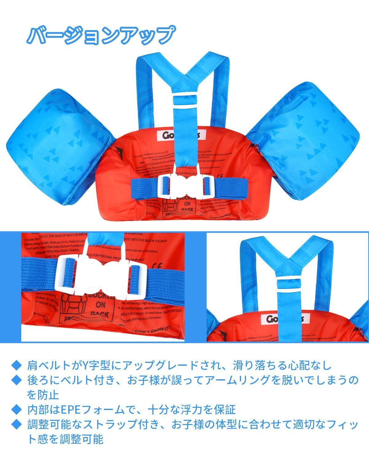 【安全性向上】EPE浮力材を使用し、空気漏れの心配がない、安全性を保証する水泳練習補助具。肩ベルトがY字型にアップグレードされ、滑り落ちる心配がありません。