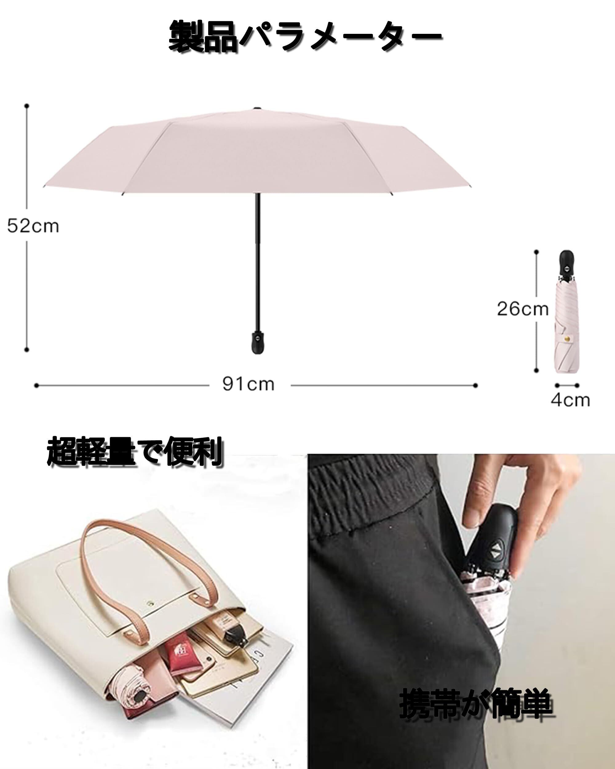 【軽量 携帯便利】 折りたたみ日傘フラットなデザインで、バッグに簡単に入れることができます。折りたたんだ厚さはわずか4cm、長さは26cm、重さは約227gです。超コンパクトボディ 使用?携帯に便利!全天候対応でき、雨の日も雪の日も晴天も使えます。男女兼用ワンタッチ 自動開閉折り畳み傘。通学、通勤、遠足、旅行,出張などの場合がご利用できます。