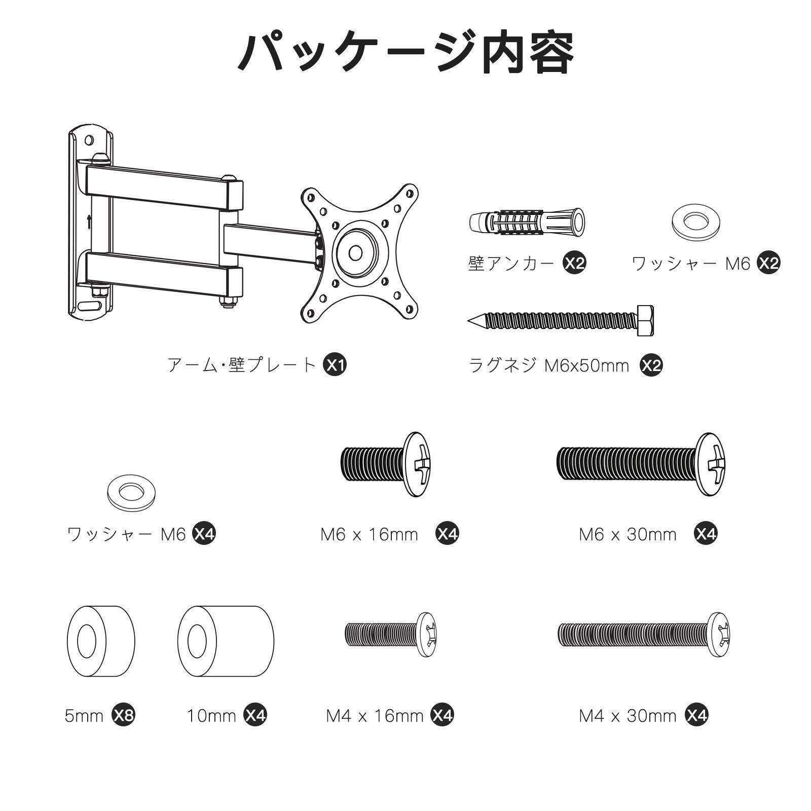 【思ったより簡単に設置】Step①部品がすべて揃っているかご確認ください。②テレビにVESAプレートを取り付けます。Step③壁に壁プレートをネジ止めします。Step④VESAプレートを取り付けたテレビを壁プレートにひっかけます。Step⑤テレビ壁掛け金具をお好みの角度に調節します。ご注意:商品の品質には十分注意を払っておりますが、初期不良、欠品、及び配送中の事故等での破損が生じた場合、返品や交換対応をさせていただきます。組み立てについて、何かご問題、ご不明な点がございましたら、ぜひ、ご遠慮なく、こちらに連絡してください。