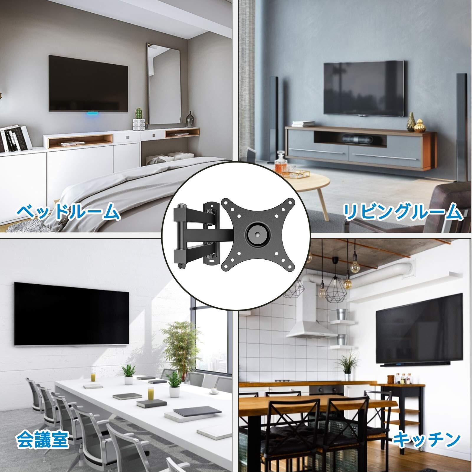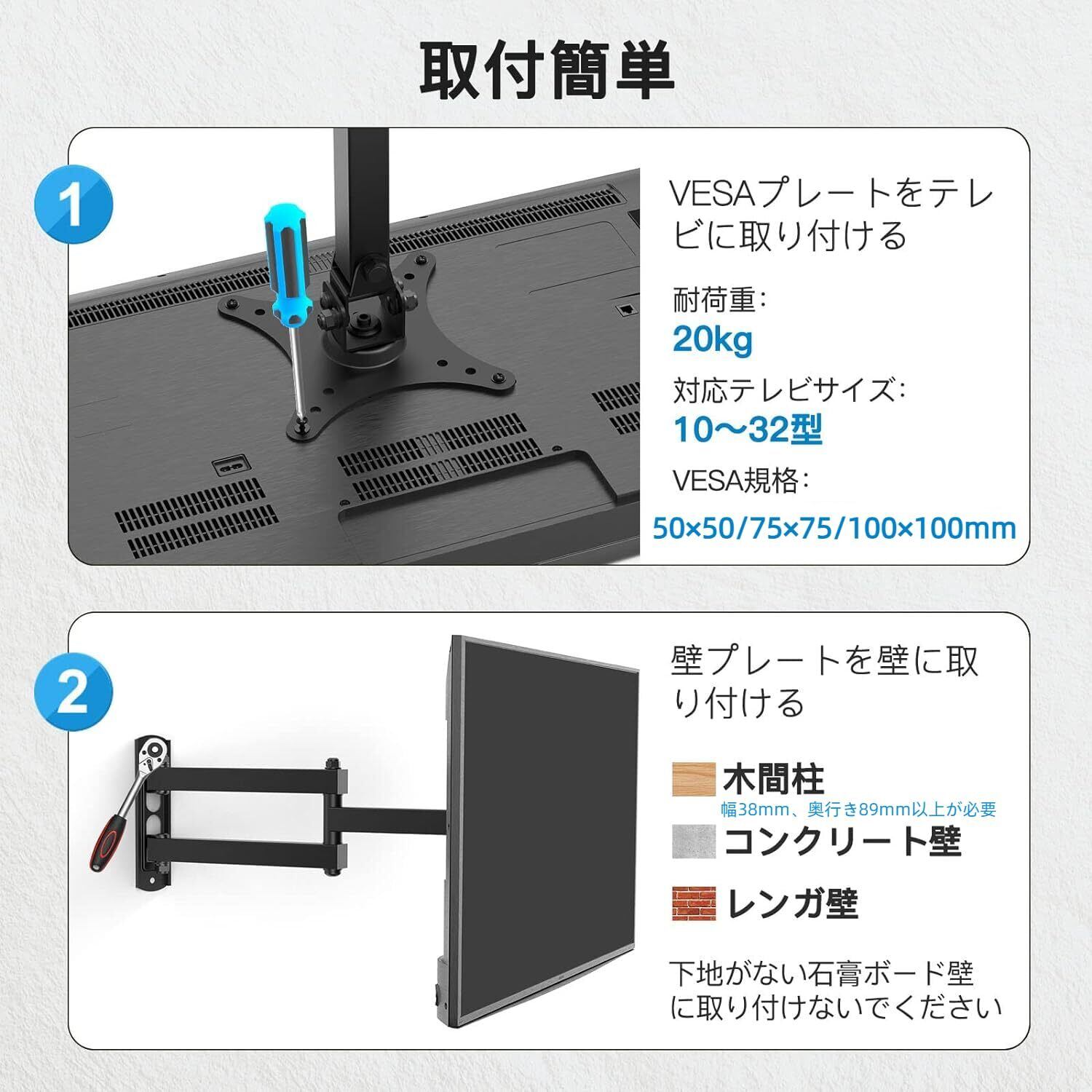 【ご購入前の確認ポイント】※次の条件を同時に満たす必要があります。①テレビのサイズは10~32インチまで。②テレビとテレビアクセサリーの重量は20㎏以内。③50×50mm、75×75mm、100×100mmのVESA規格に対応しています(他のVESA規格に対応しません)。④取付可能壁タイプ:木間柱壁(柱の寸法は取付ける面の幅38mmと奥行き89mm以上が必要です)・コンクリート壁・レンガ壁。ご注意:テレビの背面に段差がある場合は、商品に付属のスペーサーをご使用ください。スペーサーはテレビと金具の間隔をあけ、段差を避けたり配線しやすくする部品です。
